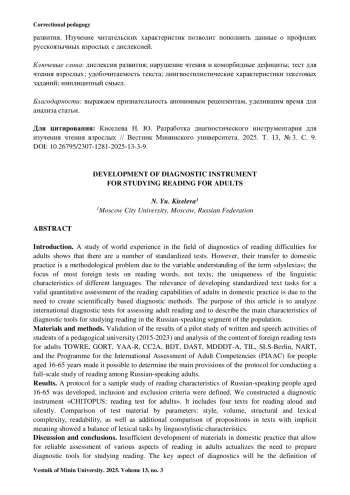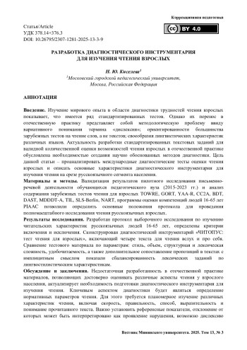 Введение. Изучение мирового опыта в области диагностики трудностей чтения взрослых показывает, что имеется ряд стандартизированных тестов. Однако их перенос в отечественную практику представляет собой методологическую проблему ввиду вариативного понимания термина «дислексия»; ориентированности большинства зарубежных тестов на чтение слов, а не текстов; своеобразия лингвистических характеристик различных языков. Актуальность разработки стандартизированных текстовых заданий для валидной количественной оценки возможностей чтения взрослых в отечественной практике обусловлена необходимостью создания научно обоснованных методов диагностики. Цель данной статьи – проанализировать международные диагностические тесты оценки чтения взрослых и описать основные характеристики диагностического инструментария для изучения чтения на срезе русскоязычного сегмента населения.