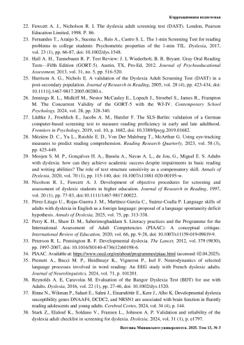 38. Stark Z., Elalouf K., Soldano V., Franzen L., Johnson A. P. Validation and reliability of the dyslexia adult checklist in screening for dyslexia // Dyslexia. 2024. Vol. 31 (1). Р. e1797.