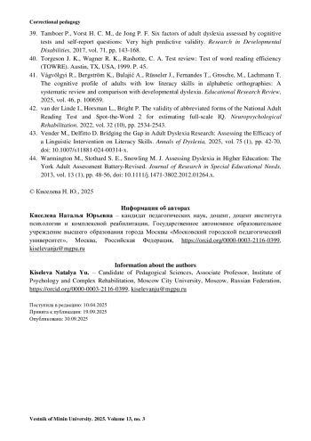 10. Киселева Н. Ю. Изучение коморбидности нарушений чтения и письма у взрослых // Дефектология. 2025. № 1. С. 36-44. https://doi.org/10.47639/0130-3074_2025_1_36.