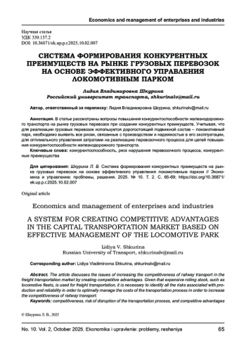 1. Жаков В. В. Управление конкурентоспособностью транспортных компаний // Экономика железных дорог. 2022. № 12. С. 62-71. EDN: CWHAXJ