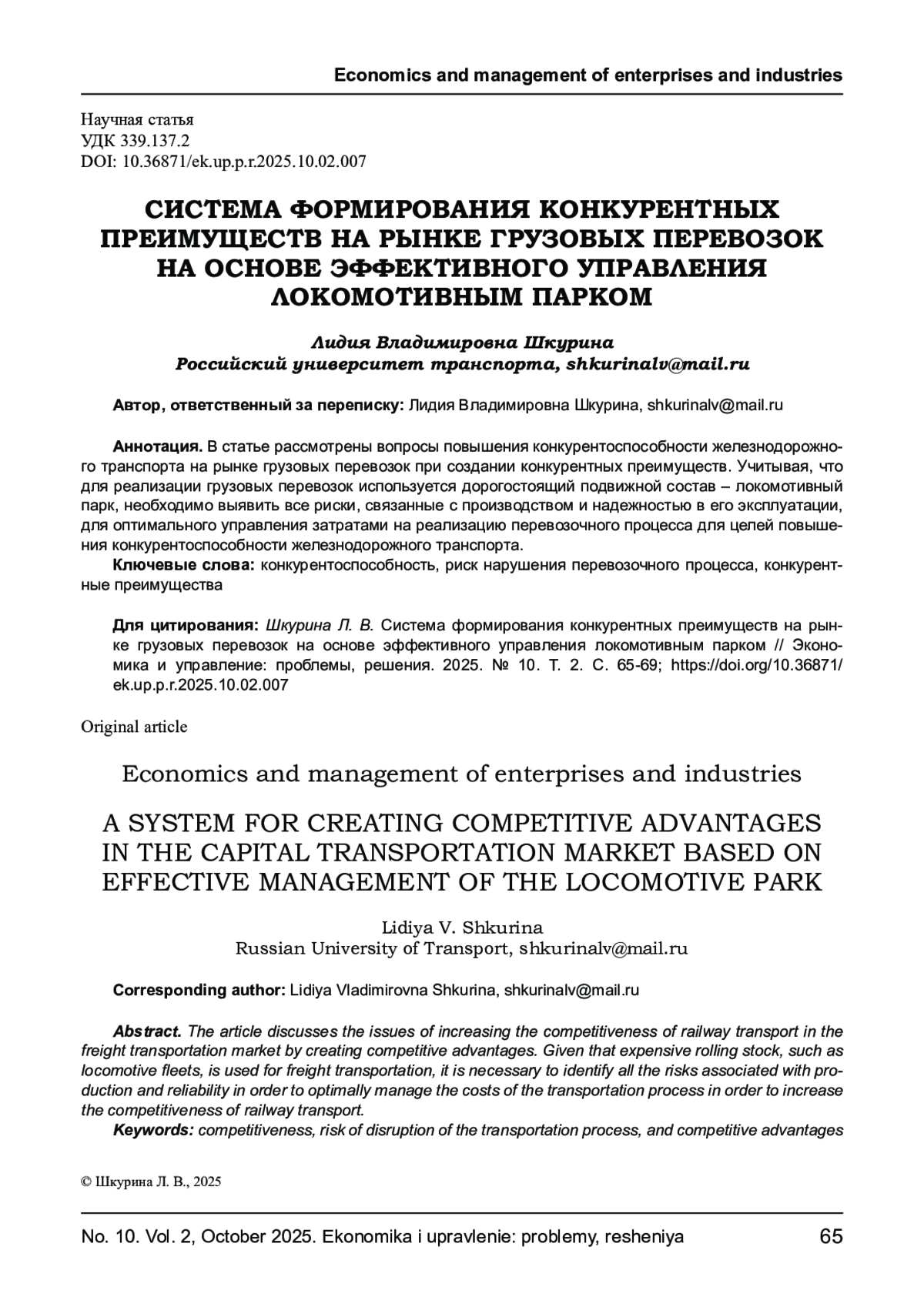 10. Радионова В. А. Исследование и оценка конкурентоспособности транспортных компаний в Российской Федерации // Современные научные исследования и инновации. 2019. № 3. С. 9. EDN: ZDSUZF