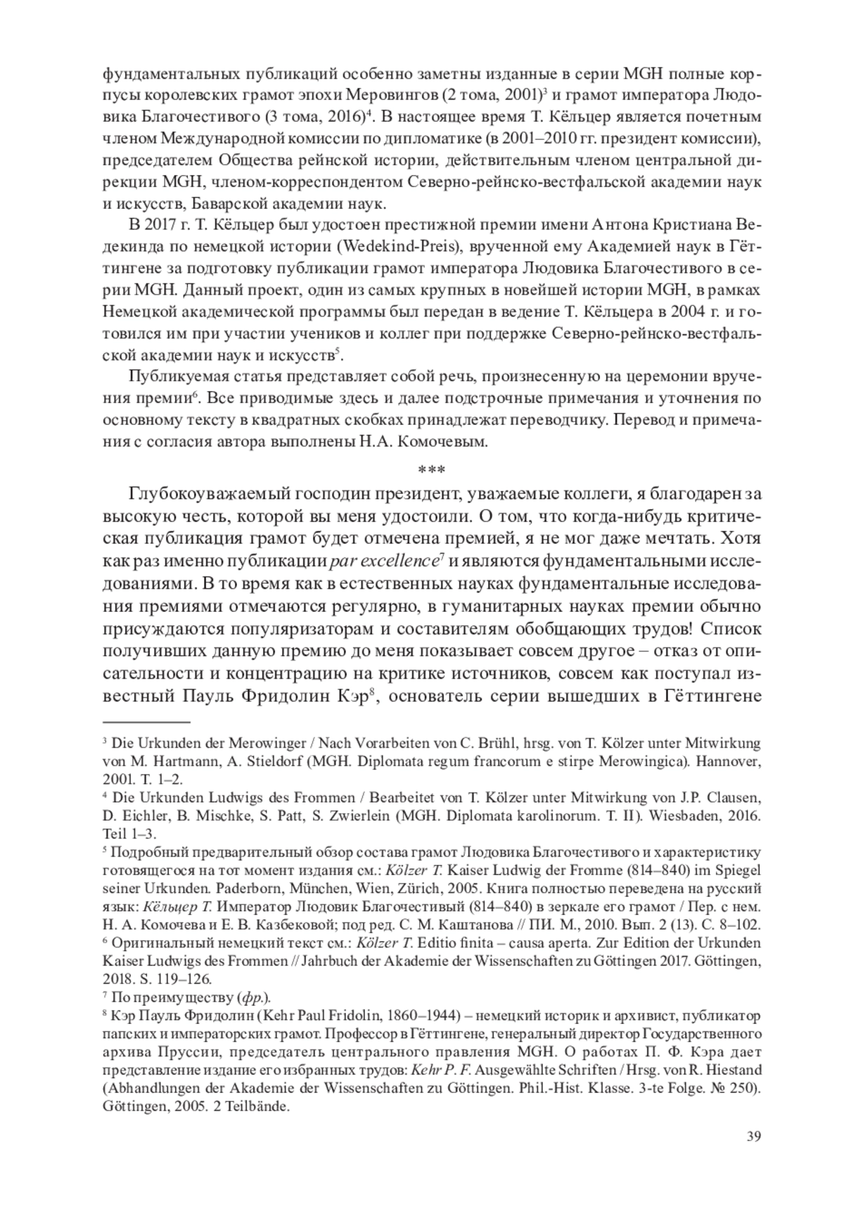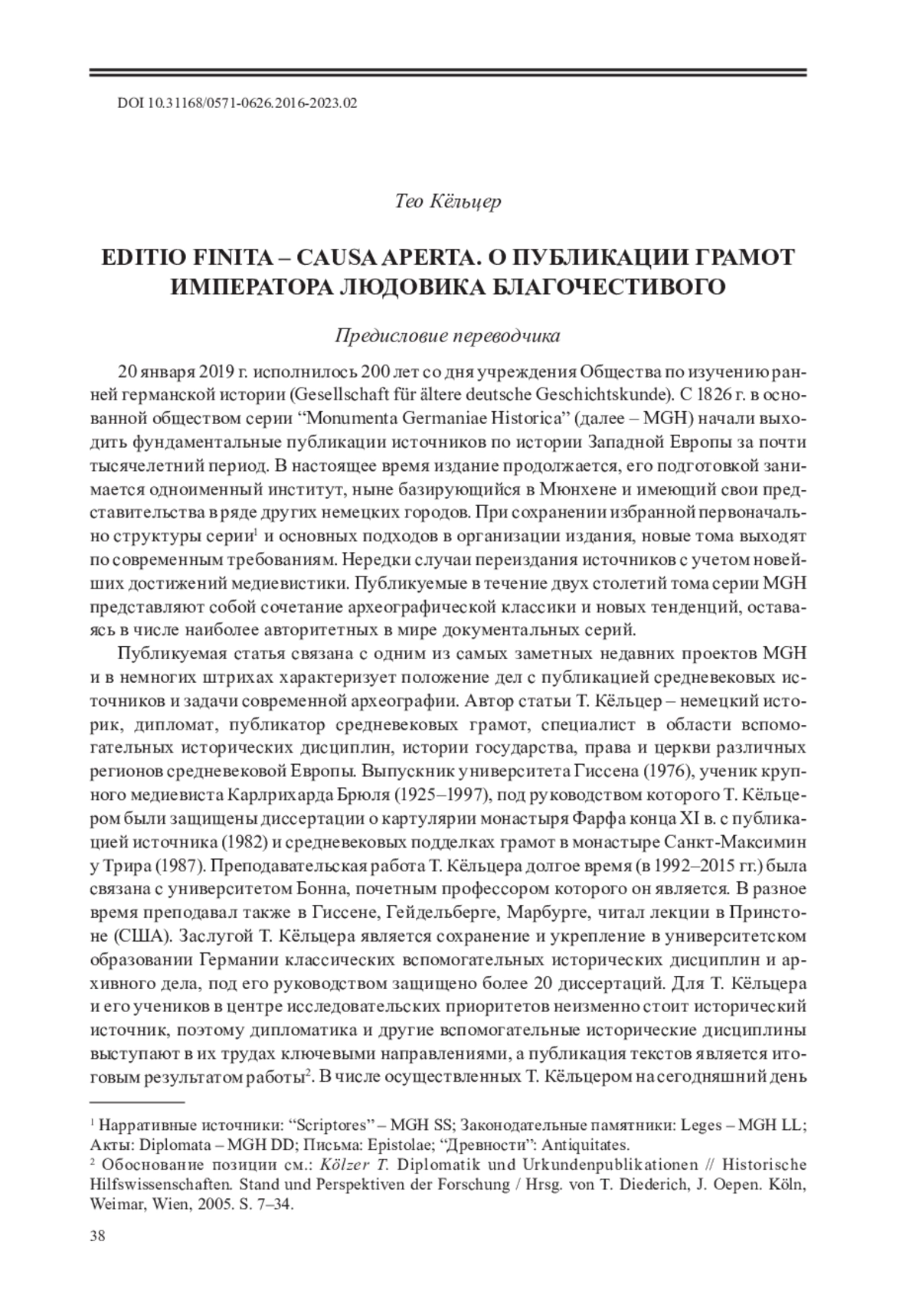 Публикуемая статья связана с одним из самых заметных недавних проектов MGH и в немногих штрихах характеризует положение дел с публикацией средневековых источников и задачи современной археографии. Автор статьи Т. Кёльцер – немецкий историк, дипломат, публикатор средневековых грамот, специалист в области вспомогательных исторических дисциплин, истории государства, права и церкви различных регионов средневековой Европы. Выпускник университета Гиссена (1976), ученик крупного медиевиста Карлрихарда Брюля (1925–1997), под руководством которого Т. Кёльцером были защищены диссертации о картулярии монастыря Фарфа конца XI в. с публикацией источника (1982) и средневековых подделках грамот в монастыре Санкт-Максимин у Трира (1987). Преподавательская работа Т. Кёльцера долгое время (в 1992–2015 гг.) была связана с университетом Бонна, почетным профессором которого он является. В разное время преподавал также в Гиссене, Гейдельберге, Марбурге, читал лекции в Принстоне (США). Заслугой Т. Кёльцера является сохранение и укрепление в университетском образовании Германии классических вспомогательных исторических дисциплин и архивного дела, под его руководством защищено более 20 диссертаций. Для Т. Кёльцера и его учеников в центре исследовательских приоритетов неизменно стоит исторический источник, поэтому дипломатика и другие вспомогательные исторические дисциплины выступают в их трудах ключевыми направлениями, а публикация текстов является итоговым результатом работы2.