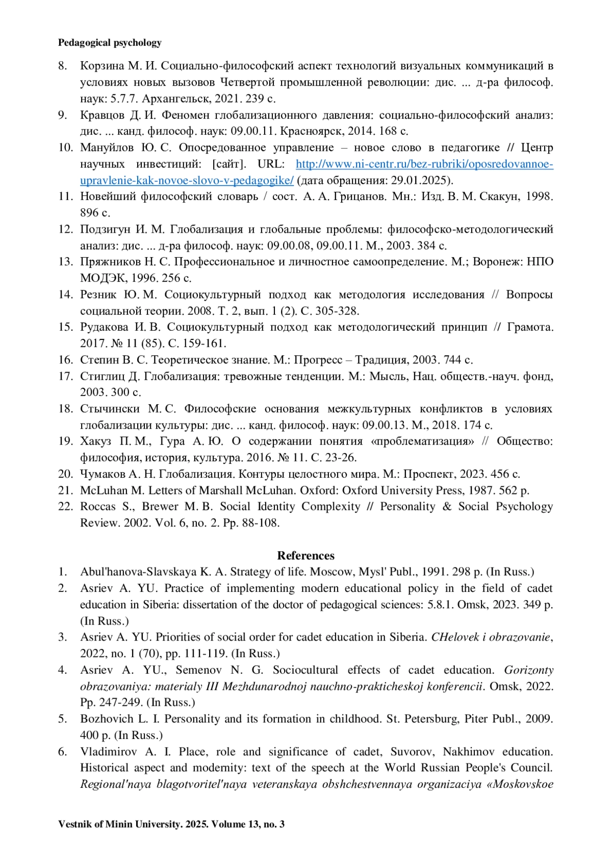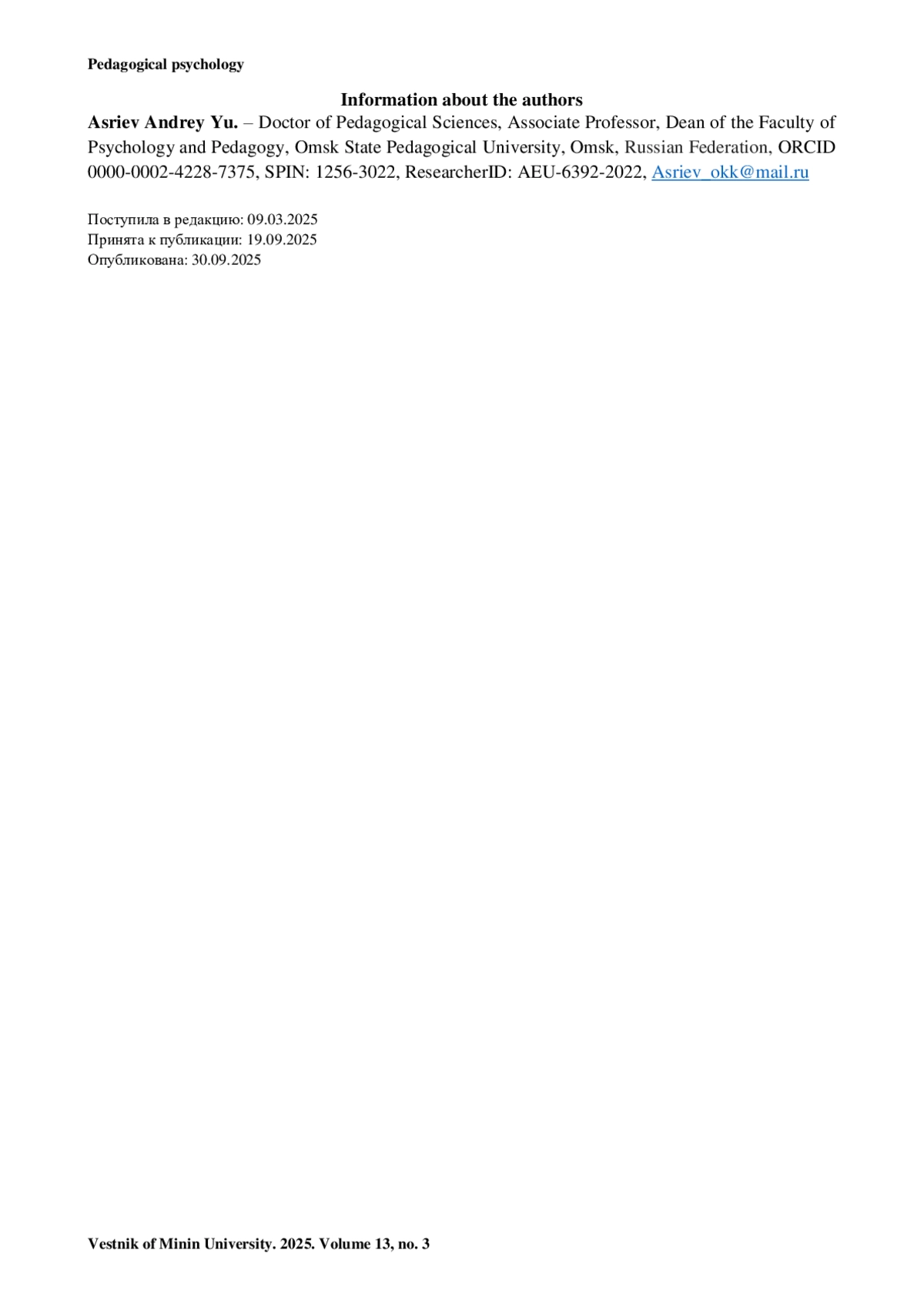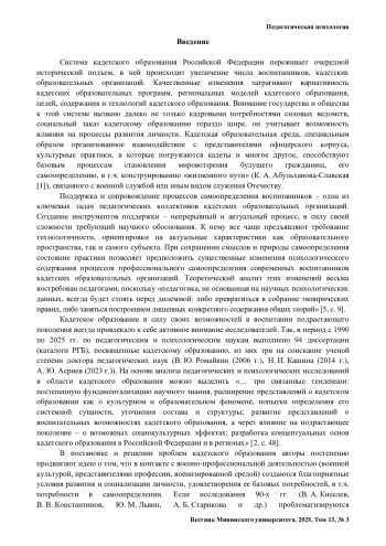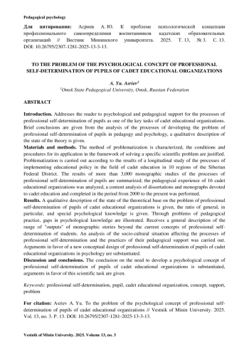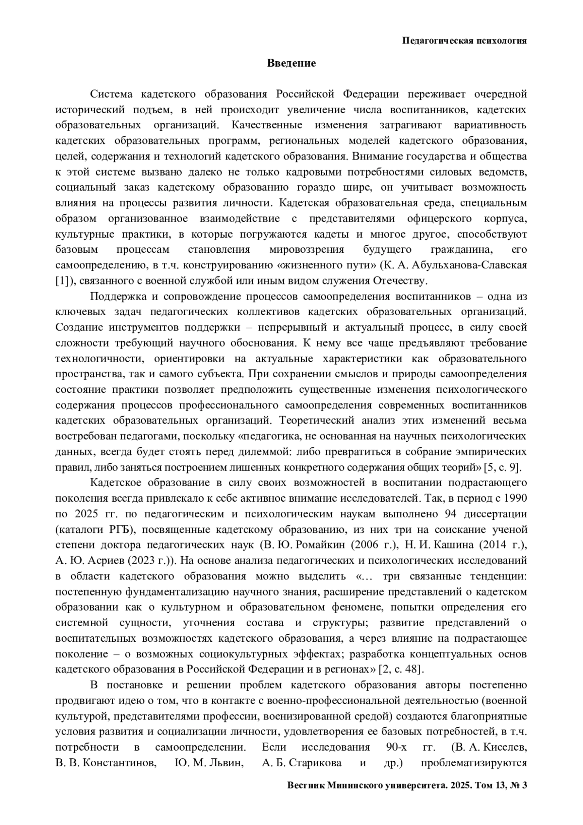 АСРИЕВ А. Ю. К ПРОБЛЕМЕ ПСИХОЛОГИЧЕСКОЙ КОНЦЕПЦИИ ПРОФЕССИОНАЛЬНОГО САМООПРЕДЕЛЕНИЯ ВОСПИТАННИКОВ КАДЕТСКИХ ОБРАЗОВАТЕЛЬНЫХ ОРГАНИЗАЦИЙ // ВЕСТНИК МИНИНСКОГО УНИВЕРСИТЕТА. 2025. ТОМ 13, № 3