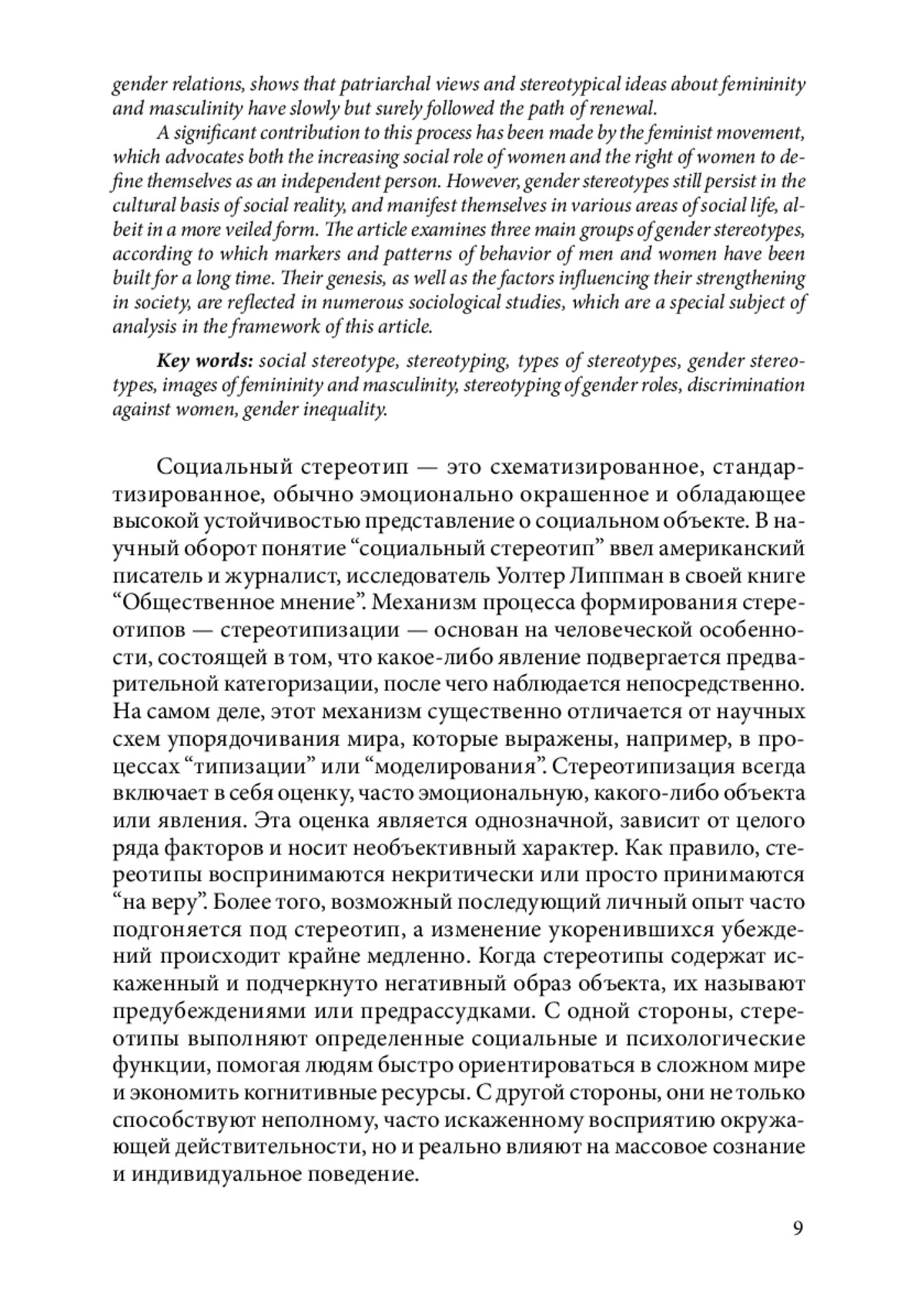 Настоящая статья продолжает тему генезиса, распространения и функционирования в обществе социальных стереотипов — схематизированных, стандартизированных, обычно эмоционально окрашенных и обладающих высокой устойчивостью представлений о социальном объекте. Как правило, стереотипы воспринимаются некритически и часто просто принимаются “на веру”, поэтому не только способствуют неполному или искаженному восприятию окружающей действительности, но и реально влияют на массовое сознание и индивидуальное поведение. В числе наиболее распространенных разновидностей стереотипов расово — этнические стереотипы, аккумулирующие набор представлений о внешности, уровне интеллекта и характере представителей разных этносов; возрастные стереотипы, получившие название “эйджизм” и стандартизирующие поведение и возможности людей в зависимости от возраста; религиозные стереотипы, воплощающие набор представлений о содержании религиозных доктрин или представителях разных конфессий; социально-классовые стереотипы, маркирующие людей в зависимости от уровня материального достатка или социального статуса. Стереотипы также укоренены во всех сферах социальной жизни, в связи с чем выделяют экономические, политические, профессиональные и т. п. стереотипы. В гендерных стереотипных представлениях, которые являются наиболее распространенными, очевидно изначально четкое распределение социальных ролей и обязанностей полов, исторически восходящее к патриархальному общественному устою, закрепляющему превосходство мужчины во всех сферах социальной жизни. История эволюции социальных отношений, в том числе и гендерных, свидетельствует о том, что патриархальные взгляды и стереотипные представления о женственности и мужественности медленно, но уверенно шли по пути обновлений. Значительный вклад в данный процесс внесло феминистское движение, выступающее как за возрастающую социальную роль женщин, так и за право женщины определять себя как самостоятельную личность. Однако гендерные стереотипы все же продолжают сохраняться в культурной основе социальной реальности, и проявляют себя в различных областях социальной жизни, хотя и в более завуалированной форме. В статье рассматриваются три основные группы гендерных стереотипов, в соответствии с которыми на протяжении долгого времени выстраивались маркеры и образцы поведения мужчины и женщины. Их генезис, а также факторы, влияющие на укрепление в обществе, нашел отражение в многочисленных социологических исследованиях, которые являются особым предметом анализа в рамках настоящей статьи.