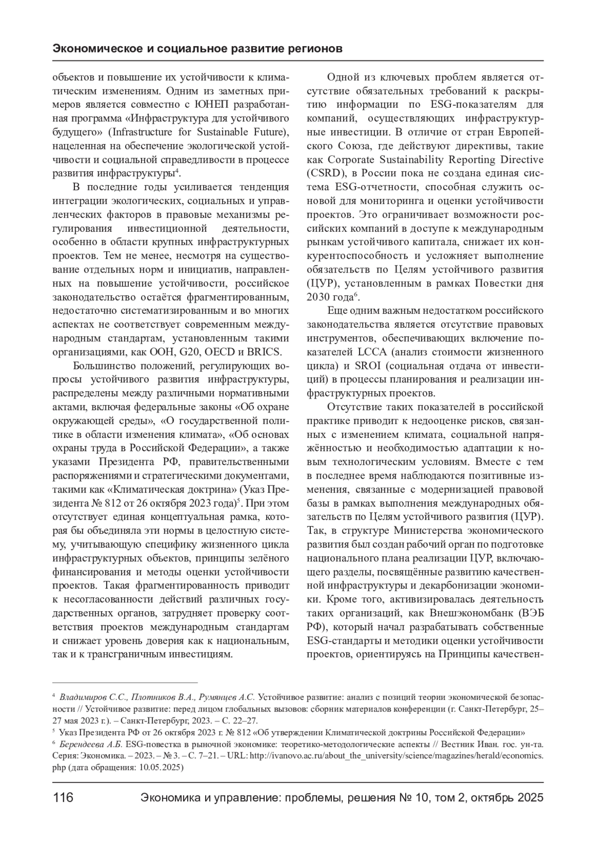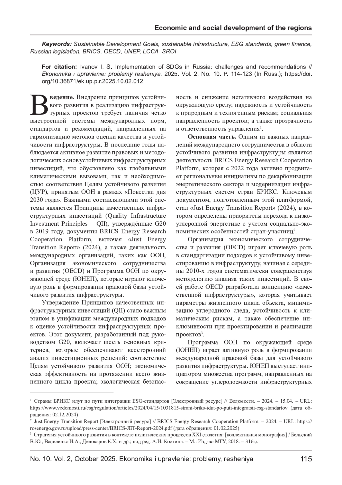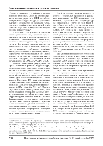 В статье анализируется реализация Целей устойчивого развития (ЦУР) ООН в России в контексте инфраструктурных проектов. Рассматриваются международные стандарты, такие как Принципы качественных инфраструктурных инвестиций G20, отчет BRICS по справедливому энергетическому переходу, роль OECD и UNEP в формировании правовой базы устойчивости. Выделяются вызовы российского законодательства: фрагментированность норм, отсутствие обязательных ESGраскрытий, инструментов LCCA и SROI, механизмов общественного участия. Предлагаются рекомендации по созданию единой концепции, внедрению сертификации, ESG-рейтингов, регулированию «зеленого» капитала и переподготовке кадров в условиях санкций. Анализ подчеркивает необходимость интеграции международных практик для повышения конкурентоспособности и доступа к устойчивым инвестициям.