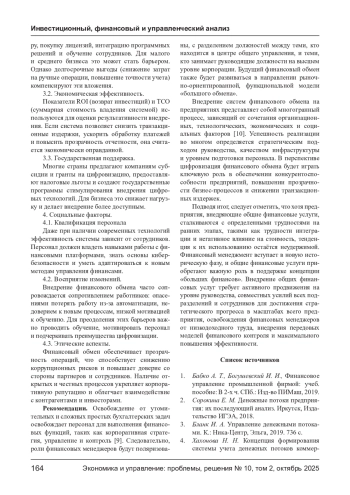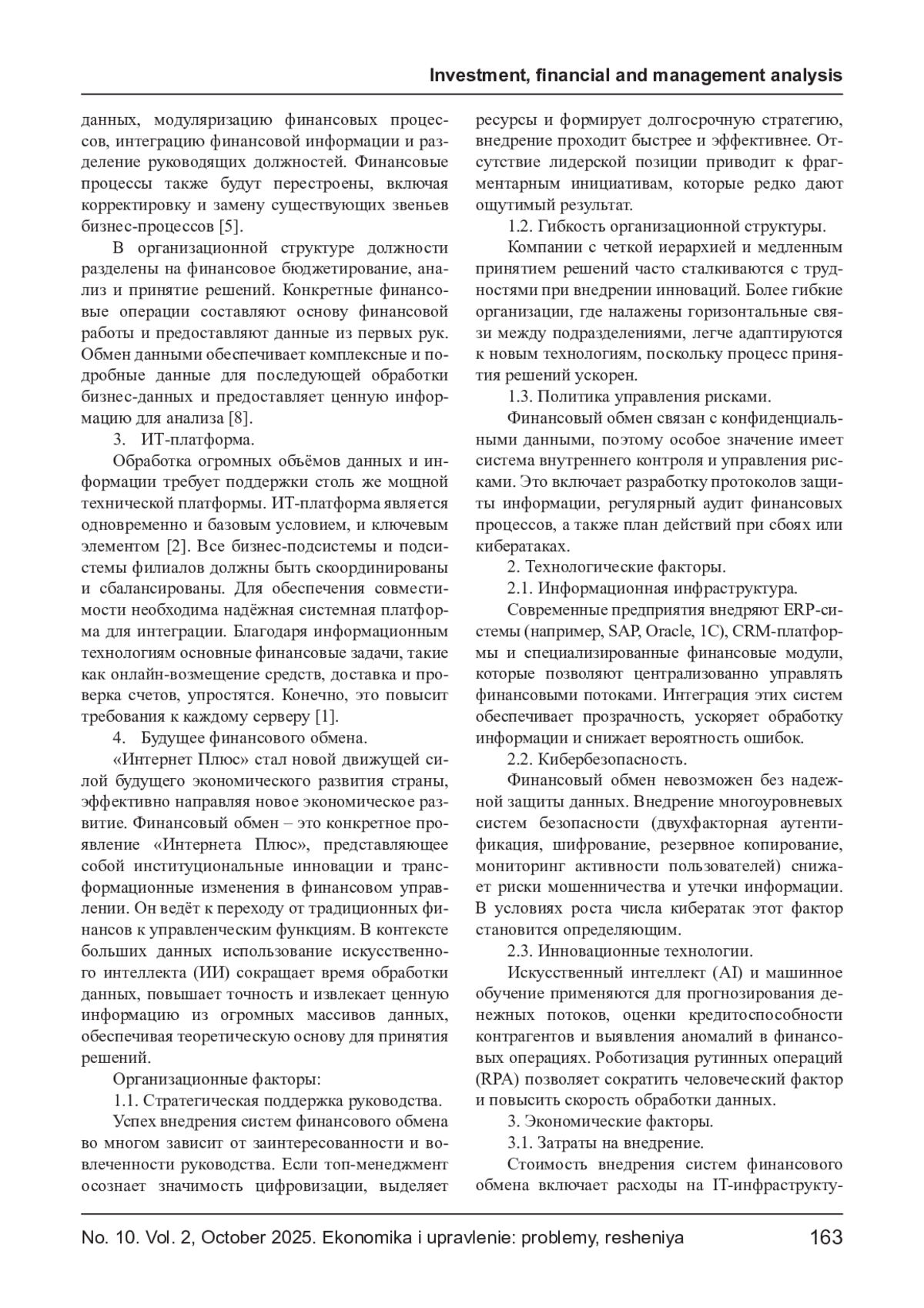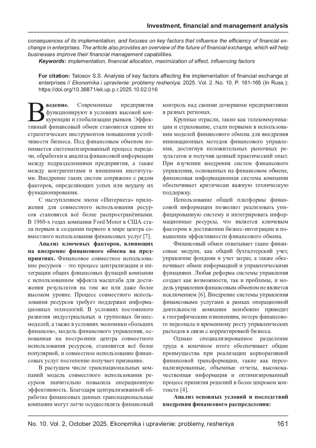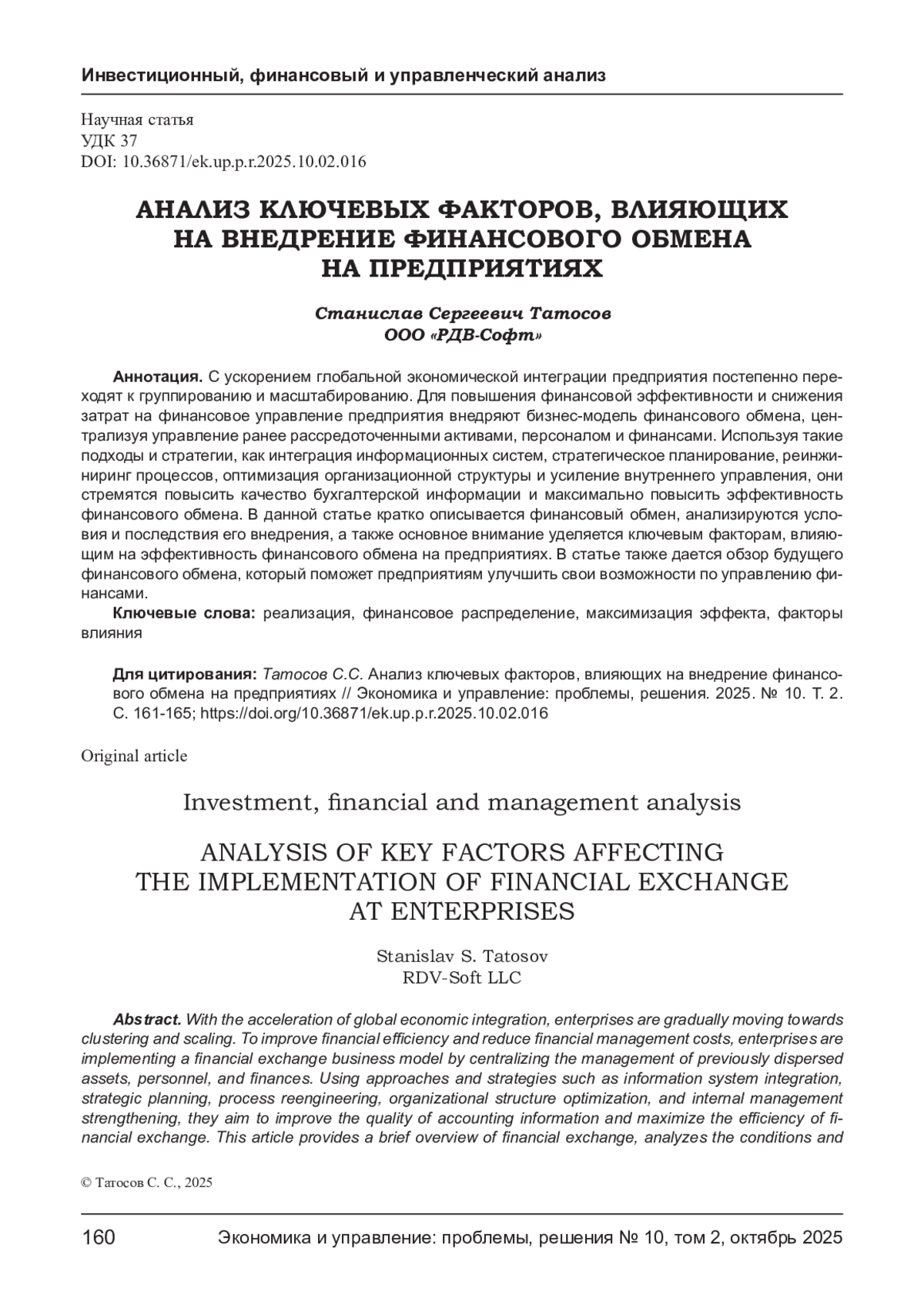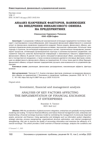 ТАТОСОВ С. С. АНАЛИЗ КЛЮЧЕВЫХ ФАКТОРОВ, ВЛИЯЮЩИХ НА ВНЕДРЕНИЕ ФИНАНСОВОГО ОБМЕНА НА ПРЕДПРИЯТИЯХ // ЭКОНОМИКА И УПРАВЛЕНИЕ: ПРОБЛЕМЫ, РЕШЕНИЯ. 2025. ТОМ 2 № 10