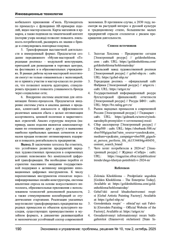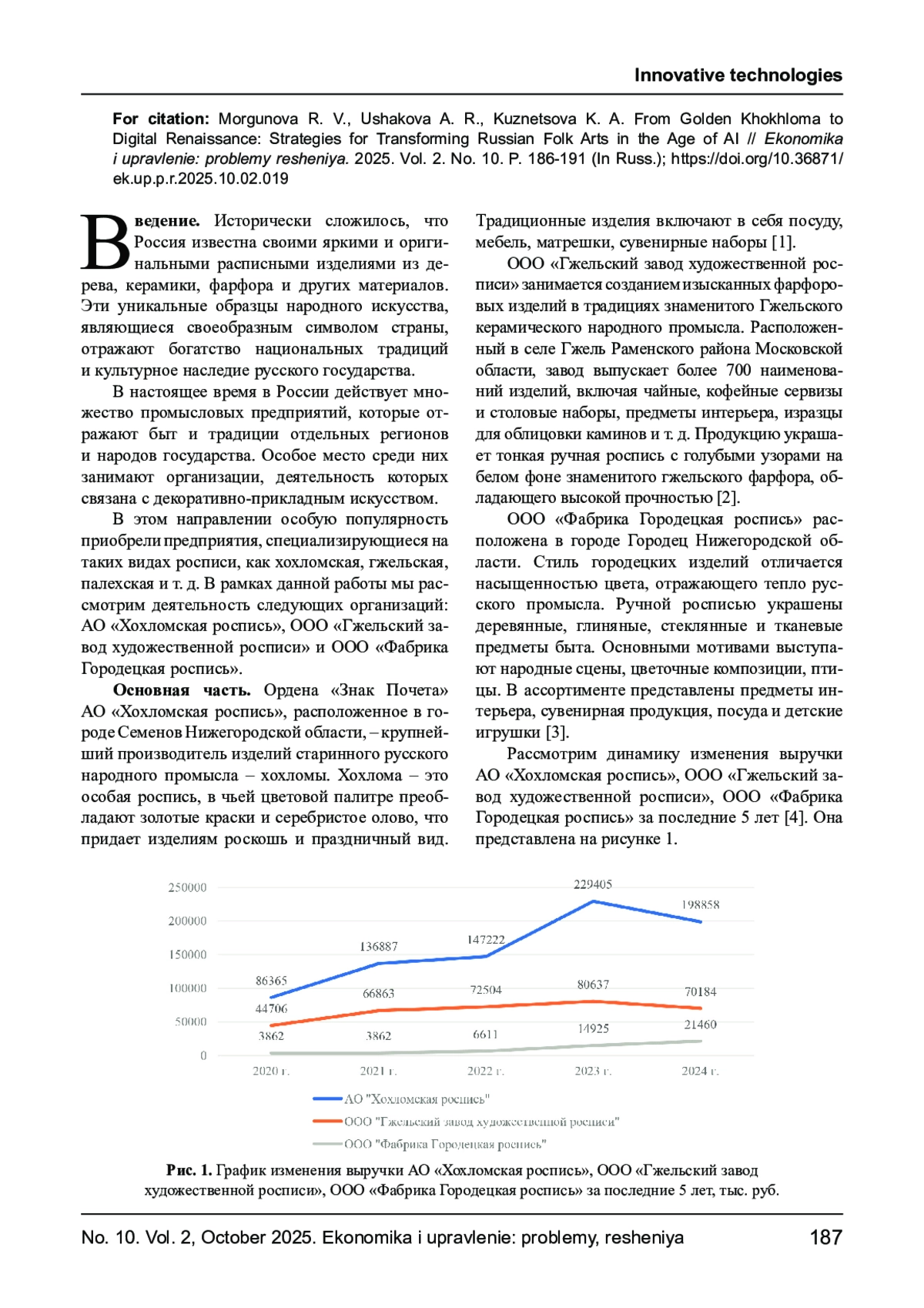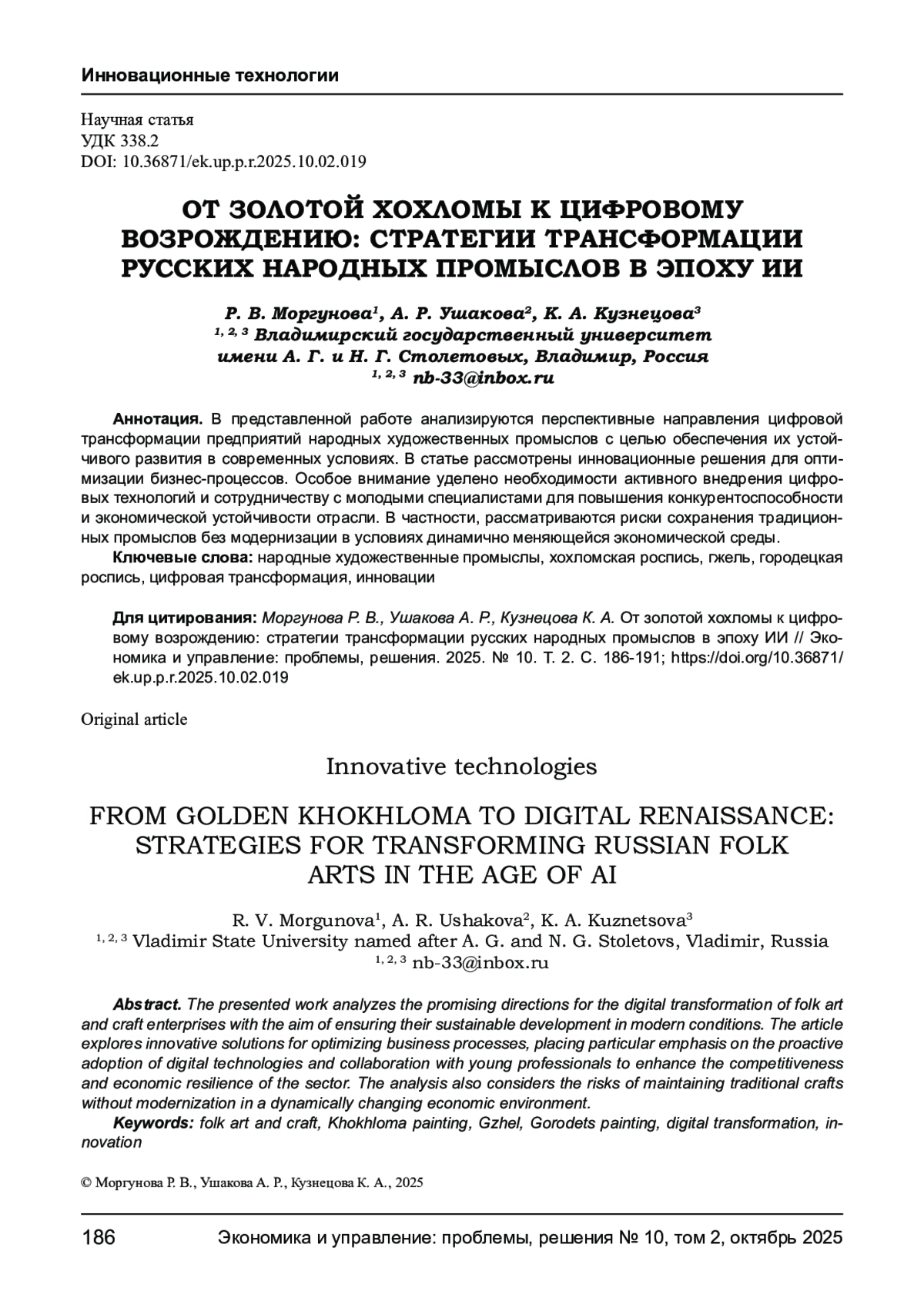 МОРГУНОВА Р. В., УШАКОВА А. Р., КУЗНЕЦОВА К. А. ОТ ЗОЛОТОЙ ХОХЛОМЫ К ЦИФРОВОМУ ВОЗРОЖДЕНИЮ: СТРАТЕГИИ ТРАНСФОРМАЦИИ РУССКИХ НАРОДНЫХ ПРОМЫСЛОВ В ЭПОХУ ИИ // ЭКОНОМИКА И УПРАВЛЕНИЕ: ПРОБЛЕМЫ, РЕШЕНИЯ. 2025. ТОМ 2 № 10