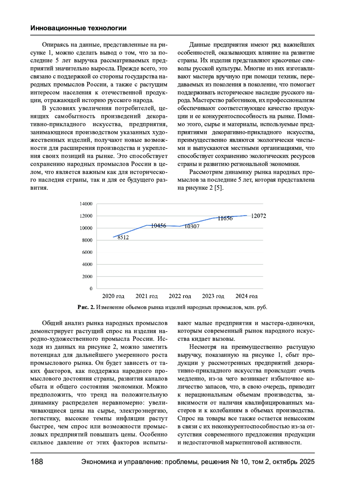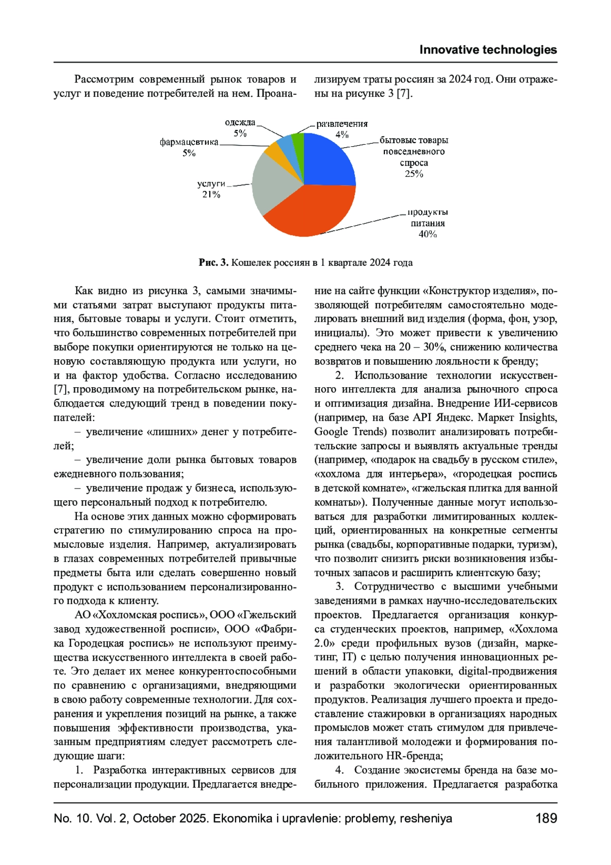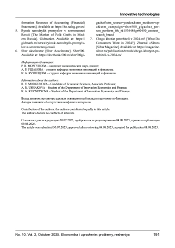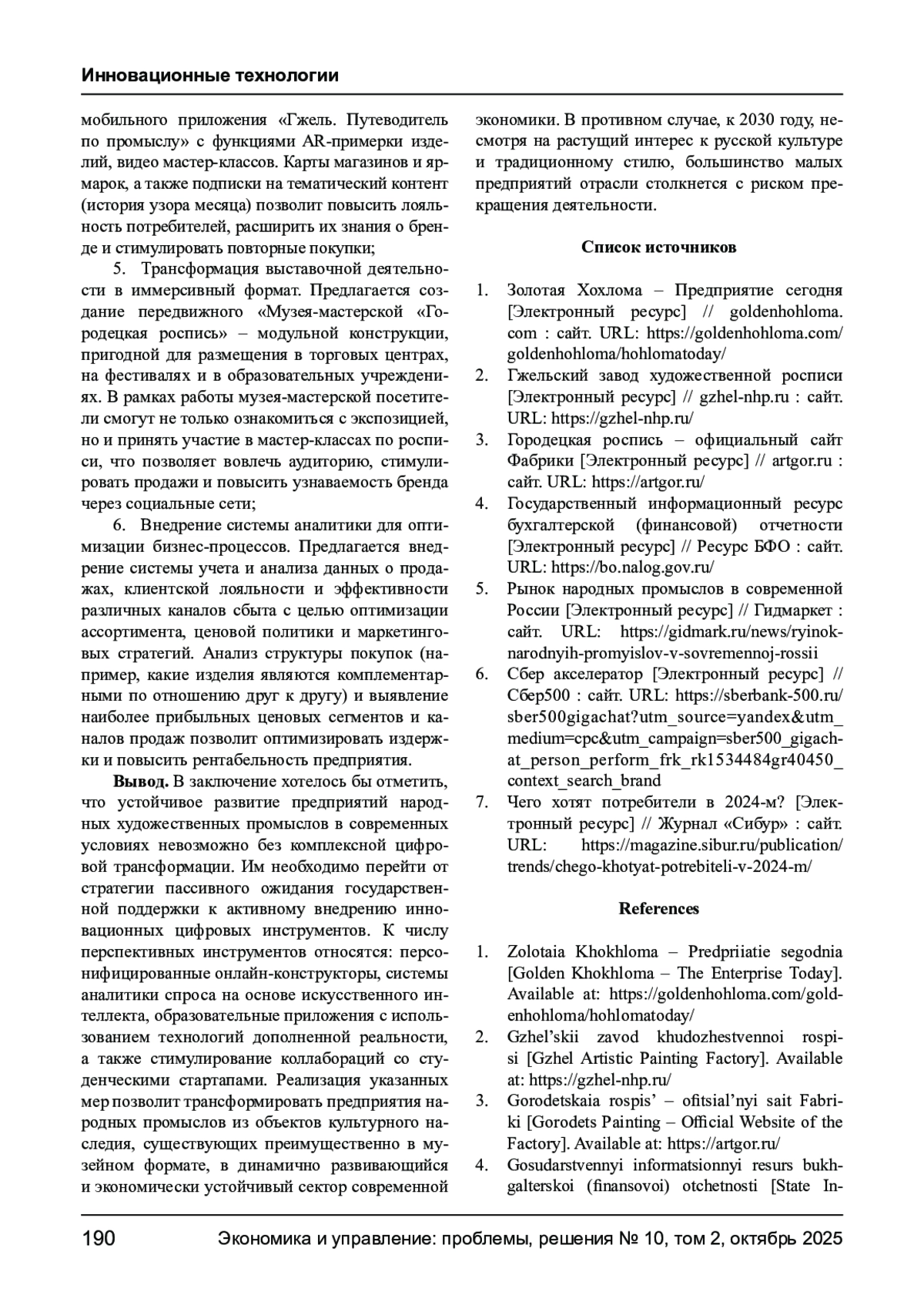 МОРГУНОВА Р. В., УШАКОВА А. Р., КУЗНЕЦОВА К. А. ОТ ЗОЛОТОЙ ХОХЛОМЫ К ЦИФРОВОМУ ВОЗРОЖДЕНИЮ: СТРАТЕГИИ ТРАНСФОРМАЦИИ РУССКИХ НАРОДНЫХ ПРОМЫСЛОВ В ЭПОХУ ИИ // ЭКОНОМИКА И УПРАВЛЕНИЕ: ПРОБЛЕМЫ, РЕШЕНИЯ. 2025. ТОМ 2 № 10