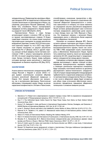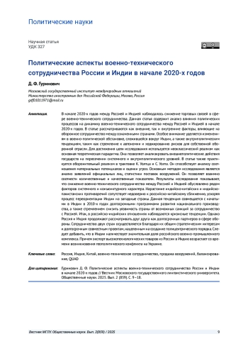 В начале 2020-х годов между Россией и Индией наблюдалось снижение торговых связей в сфере военно-технического сотрудничества. Данная статья содержит анализ влияния политических процессов на динамику военно-технического сотрудничества между Россией и Индией в начале 2020-х годов. В статье рассматриваются как внешние, так и внутренние факторы, влияющие на оборонное сотрудничество между означенными странами. Особое внимание уделяется изменениям в военно-политической обстановке, сложившейся вокруг Индии, а также внутриполитическим тенденциям, таким как стремление к автономии и хеджированию рисков для собственной оборонной отрасли. Для достижения цели исследования используется неоклассический реализм как основная теоретическая парадигма. Она позволяет анализировать внешнеполитические действия государств на пересечении системного и внутриполитического уровней. В статье также практикуется оборонительный реализм в трактовке К. Уолтца и С. Уолта. Он способствует анализу соотношения материальных потенциалов и оценки угроз. Основным методом исследования является анализ заявлений официальных лиц, статистики поставок вооружений. Он позволяет взаимно соотнести количественные и качественные показатели. Результаты исследования показывают, что снижение военно-технического сотрудничества между Россией и Индией обусловлено рядом факторов системного и конъюнктурного характера. Нарастание индийско-китайских и индийско-пакистанских противоречий сопутствует недоверию к российско-китайскому сближению, ускоряя процесс переориентации Индии на западные страны. Данная тенденция совмещается с начатыми в Индии в 2010-х годах долгосрочными программами развития национального производства, а также стремлением снизить уязвимость страны от возможных санкций за сотрудничество с Россией. Итак, в российско-индийских отношениях наблюдаются кризисные тенденции. Однако Россия и Индия продолжают рассматривать друг друга как долгосрочных партнеров в сфере обороны. Сотрудничество двух стран осуществляется благодаря их общим стратегическим интересам и долгосрочным совместным проектам, нацеленным на создание полицентрического порядка. Следует добавить, что в Индии наличествует значительная доля российского военно-промышленного комплекса. Причем экспорт высокотехнологических товаров из России в Индию возрастает со времени возникновения геополитического конфликта на Украине.