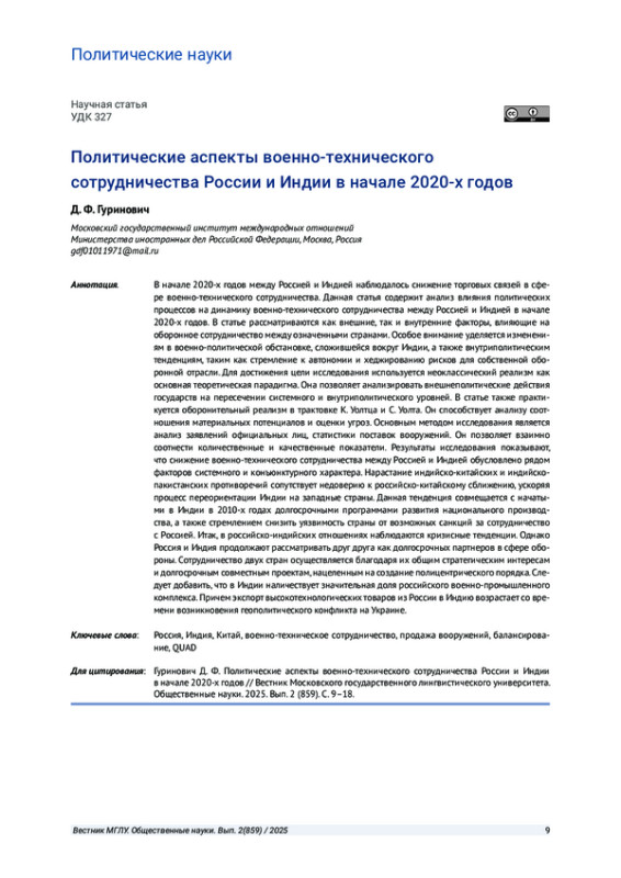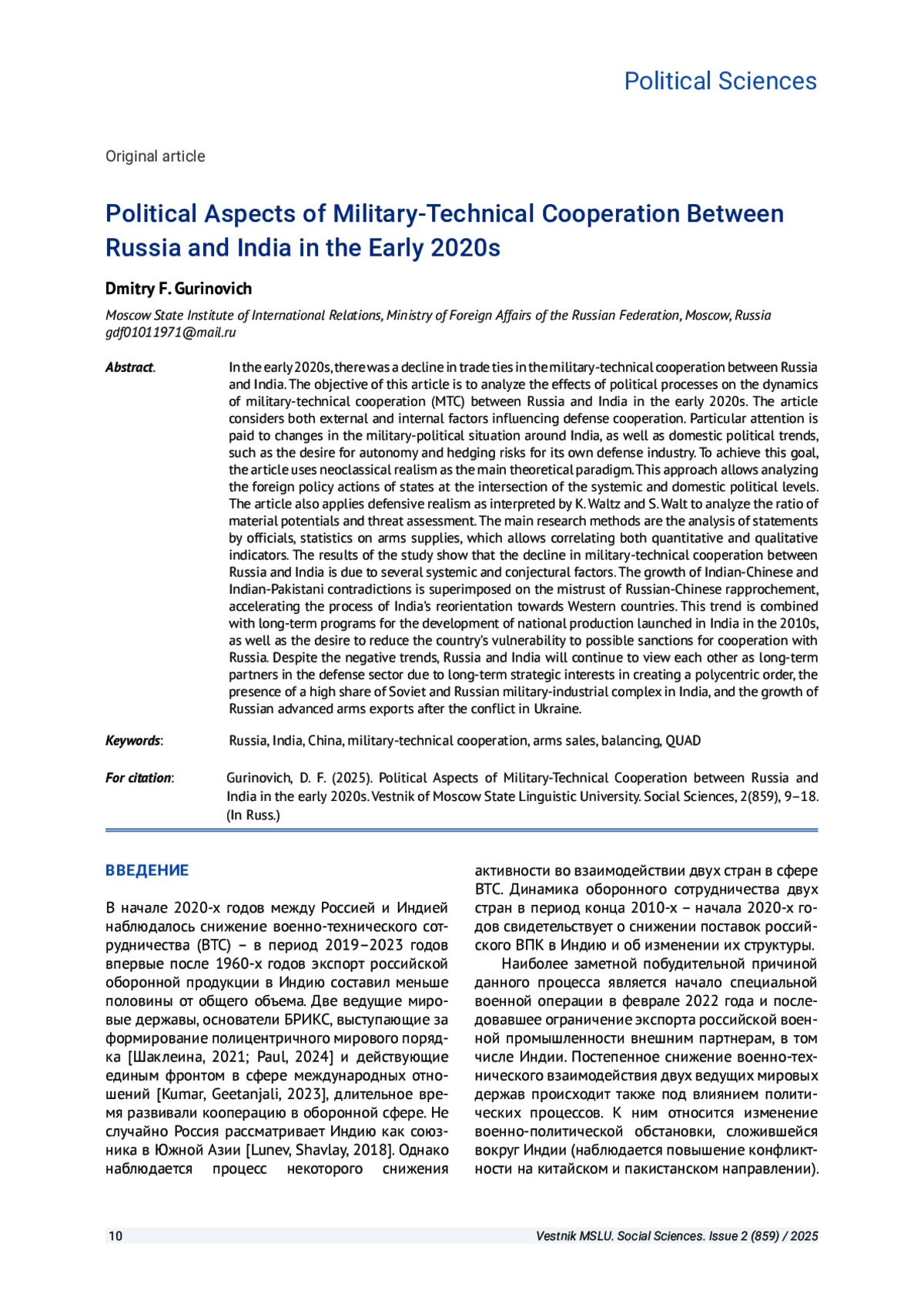 21. Kashin V. The Changing Contours of Russia-India Defense Engagement // MGIMO Review of International Relations. 2023. Vol. 16. № 2. P. 104-119. EDN: VZDUXU