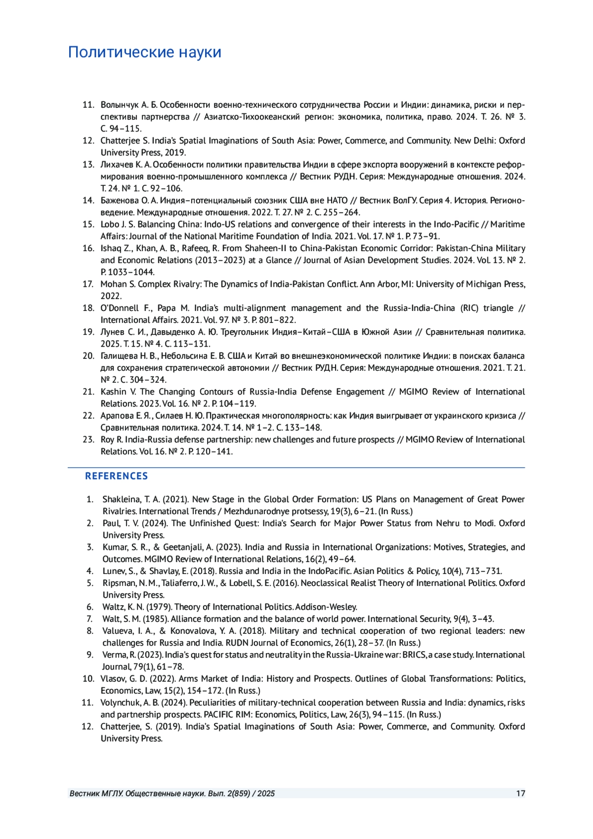 11. Волынчук А. Б. Особенности военно-технического сотрудничества России и Индии: динамика, риски и перспективы партнерства // Азиатско-Тихоокеанский регион: экономика, политика, право. 2024. Т. 26. № 3. С. 94-115. EDN: DQFGHK