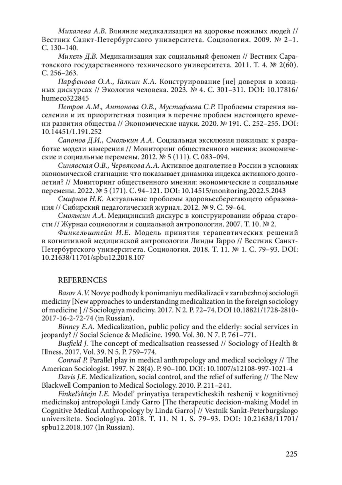 6. Михалева А.В. Влияние медикализации на здоровье пожилых людей // Вестник Санкт-Петербургского университета. Социология. 2009. №. 2-1. С. 130-140.