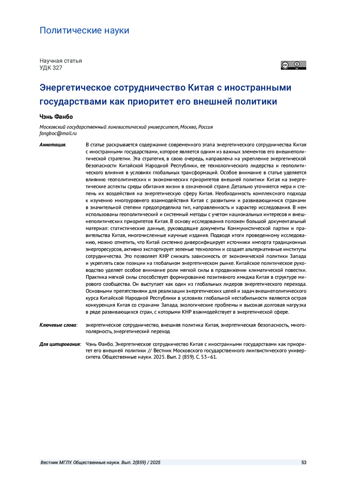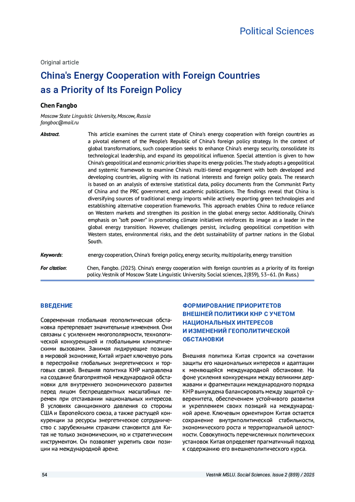 ЧЭНЬ Ф. ЭНЕРГЕТИЧЕСКОЕ СОТРУДНИЧЕСТВО КИТАЯ С ИНОСТРАННЫМИ ГОСУДАРСТВАМИ КАК ПРИОРИТЕТ ЕГО ВНЕШНЕЙ ПОЛИТИКИ // ВЕСТНИК МОСКОВСКОГО ГОСУДАРСТВЕННОГО ЛИНГВИСТИЧЕСКОГО УНИВЕРСИТЕТА. ОБЩЕСТВЕННЫЕ НАУКИ. 2025. № 2 (859)