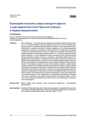 Цель исследования - дать характеристику деятельности руководства Северо-Западным фронтом 1-й и 2-й Армий, входящих в его состав. Корпусам дивизий этих армий была доверена координация войск в ходе ведения Восточно-Прусской операции. В статье применяются историко-системный и историко-типологический методы исследования. Они отвечают современным требованиям к историческим исследованиям. Использование этих методов позволило провести исследование достаточно большого количества исторических документов Ставки Верховного главнокомандующего, Северо-Западного фронта, штабов 1-й и 2-й армий и некоторых корпусов дивизий, входящих в их состав. Приводятся примеры согласования усилий между различными органами управления, армиями, корпусами и дивизиями в ходе ведения боевых действий последовательно по дням операции и направлениям действий войск. Отмечаются сложности в поддержании взаимодействия войск на различных этапах проведения боевых операций. Сложности возникают при выдвижении к государственной границе, завязке боя, ведении боевых действий, выходе из боя, выходе из окружения, отходе на другие рубежи, переходе к ведению оборонительных действий. Рассматриваются документы, позволяющие определить порядок действий командующих (командиров, начальников), их штабов на всех этапах ведения боевых операций. На основании рассмотренных исторических и аналитических документов делаются выводы о содержании, последовательности достижения устойчивого взаимодействия войск, об их составных частях и приемах по согласованию усилий различных родов войск на всех этапах ведения Восточно-Прусской операции, а при необходимости и восстановления взаимодействия; определяются причины нарушений в ходе ведения операции. Кроме того, делаются выводы о влиянии и роли организованного взаимодействия до начала операции на его поддержание и восстановление в ходе ведения.