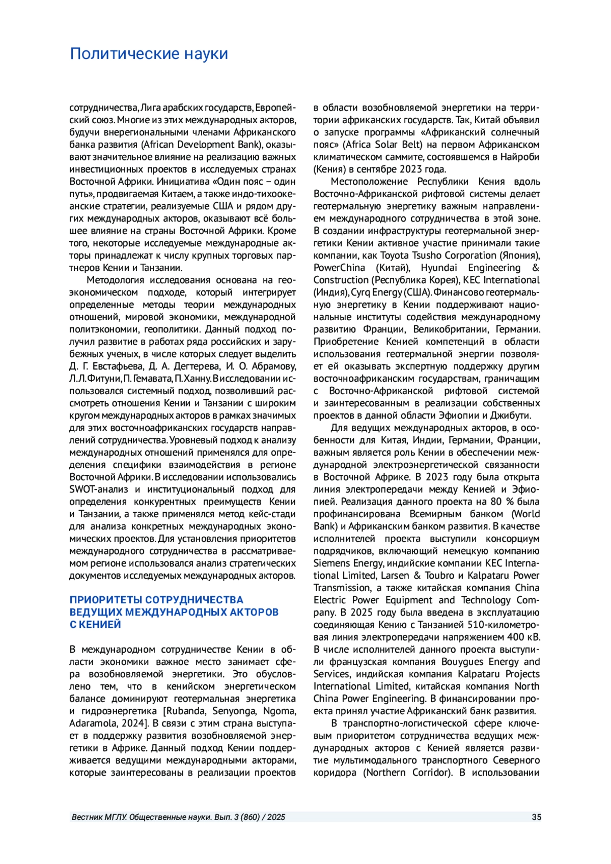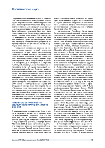 В статье исследуются приоритеты сотрудничества ведущих международных акторов с Кенией и Танзанией на современном этапе. Кения и Танзания рассматриваются в качестве ключевых стран Восточной Африки. Внимание уделяется изучению особенностей взаимодействия ведущих международных акторов с Кенией в энергетической, транспортно-логистической и цифровой сферах, а также с Танзанией в транспортно-логистической, энергетической и ресурсной сферах. В результате проведенного исследования автор приходит к выводу о том, что на современном этапе происходит развитие многосторонней системы экономических отношений ведущих международных акторов с Кенией и Танзанией. Важную роль в этом играют западные страны. Вместе с тем ведущие незападные страны последовательно наращивают сотрудничество с исследуемыми восточноафриканскими государствами, в частности в формате «гибких» международных партнерств. В рамках международного сотрудничества Кения и Танзания стремятся к защите своих национальных экономических интересов, а также развитию региональной интеграции в Восточной Африке.