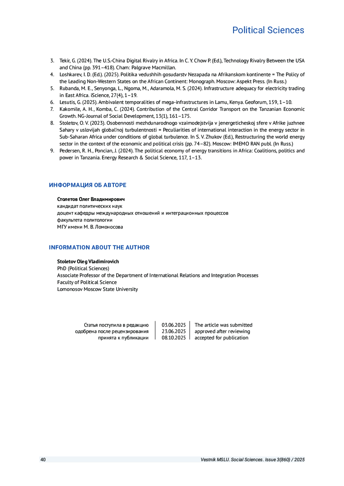 8. Столетов О. В. Особенности международного взаимодействия в энергетической сфере в Африке южнее Сахары в условиях глобальной турбулентности // Перестройка мировой энергетики в условиях экономического и политического кризиса / под ред. С. В. Жукова. М.: ИМЭМО РАН, 2023. С 74-82.
