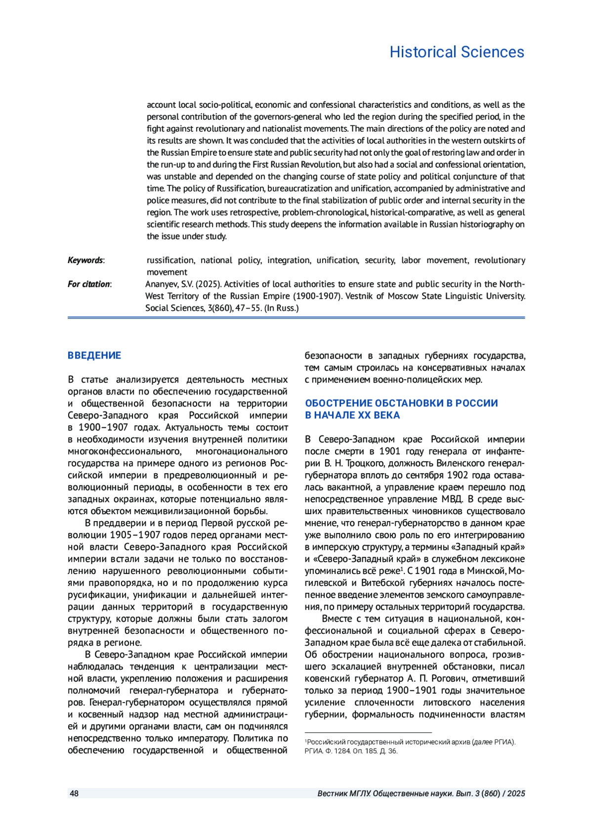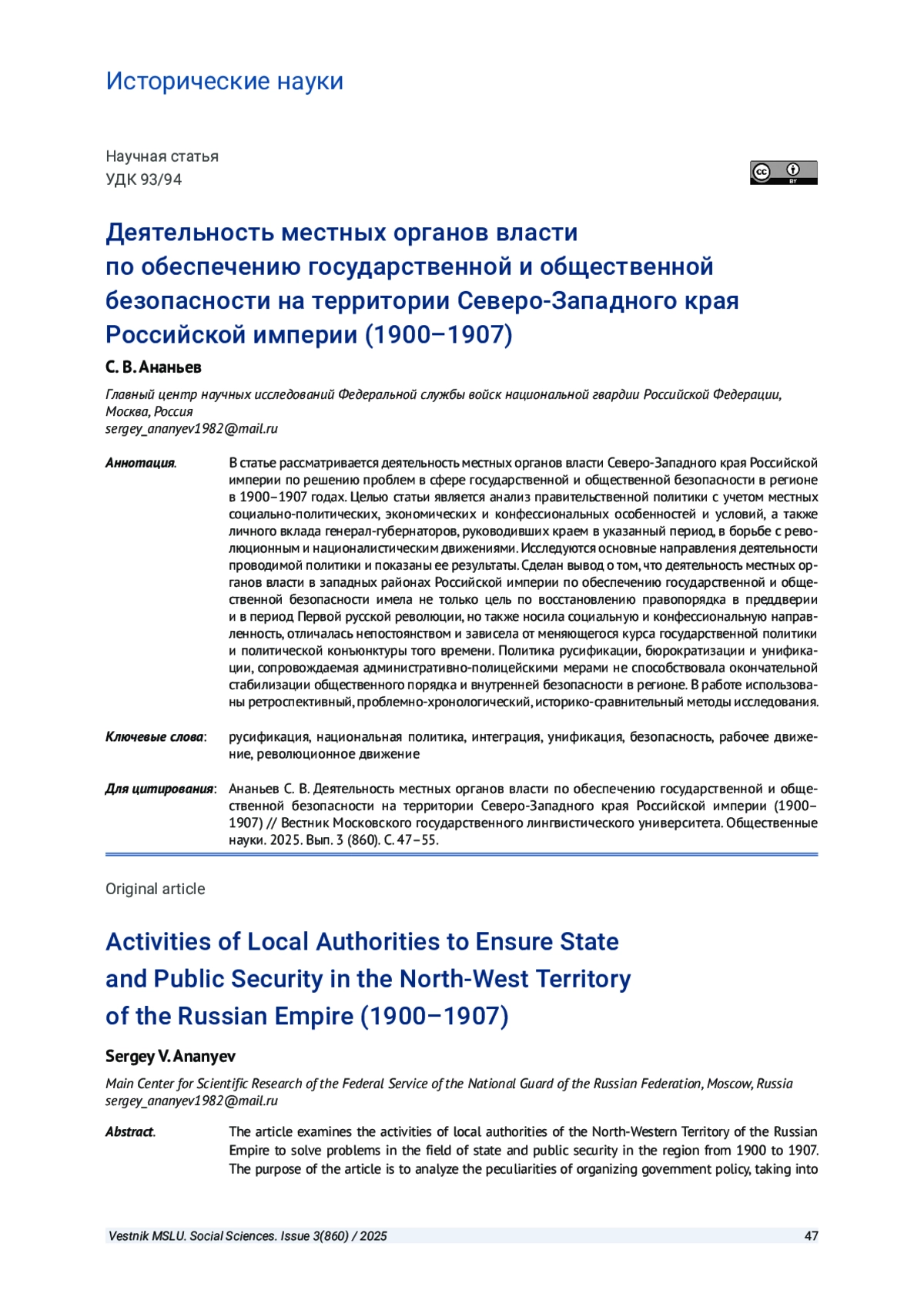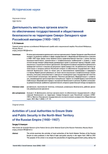 В статье рассматривается деятельность местных органов власти Северо-Западного края Российской империи по решению проблем в сфере государственной и общественной безопасности в регионе в 1900-1907 годах. Целью статьи является анализ правительственной политики с учетом местных социально-политических, экономических и конфессиональных особенностей и условий, а также личного вклада генерал-губернаторов, руководивших краем в указанный период, в борьбе с революционным и националистическим движениями. Исследуются основные направления деятельности проводимой политики и показаны ее результаты. Сделан вывод о том, что деятельность местных органов власти в западных районах Российской империи по обеспечению государственной и общественной безопасности имела не только цель по восстановлению правопорядка в преддверии и в период Первой русской революции, но также носила социальную и конфессиональную направленность, отличалась непостоянством и зависела от меняющегося курса государственной политики и политической конъюнктуры того времени. Политика русификации, бюрократизации и унификации, сопровождаемая административно-полицейскими мерами не способствовала окончательной стабилизации общественного порядка и внутренней безопасности в регионе. В работе использованы ретроспективный, проблемно-хронологический, историко-сравнительный методы исследования.