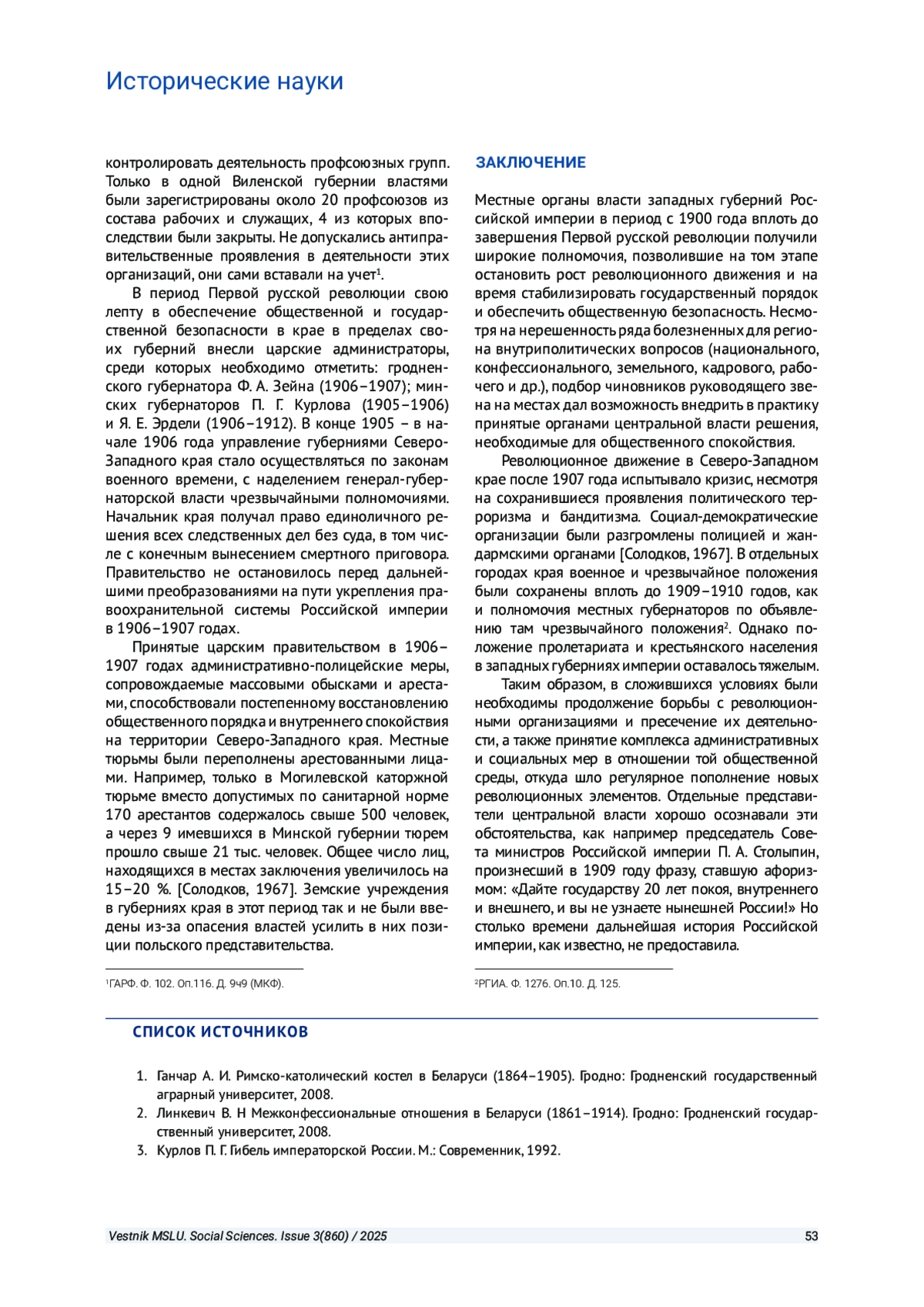 В статье анализируется деятельность местных органов власти по обеспечению государственной и общественной безопасности на территории Северо-Западного края Российской империи в 1900–1907 годах. Актуальность темы состоит в необходимости изучения внутренней политики многоконфессионального, многонационального государства на примере одного из регионов Российской империи в предреволюционный и революционный периоды, в особенности в тех его западных окраинах, которые потенциально являются объектом межцивилизационной борьбы.