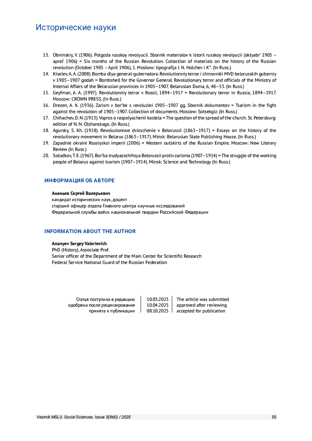 14. Киселев А. А. Бомба для генерал-губернатора. Революционный террор и чиновники МВД белорусских губерний в 1905-1907 годах // Беларуская думка. 2008. № 6. С. 48-53. EDN: SBYGMZ