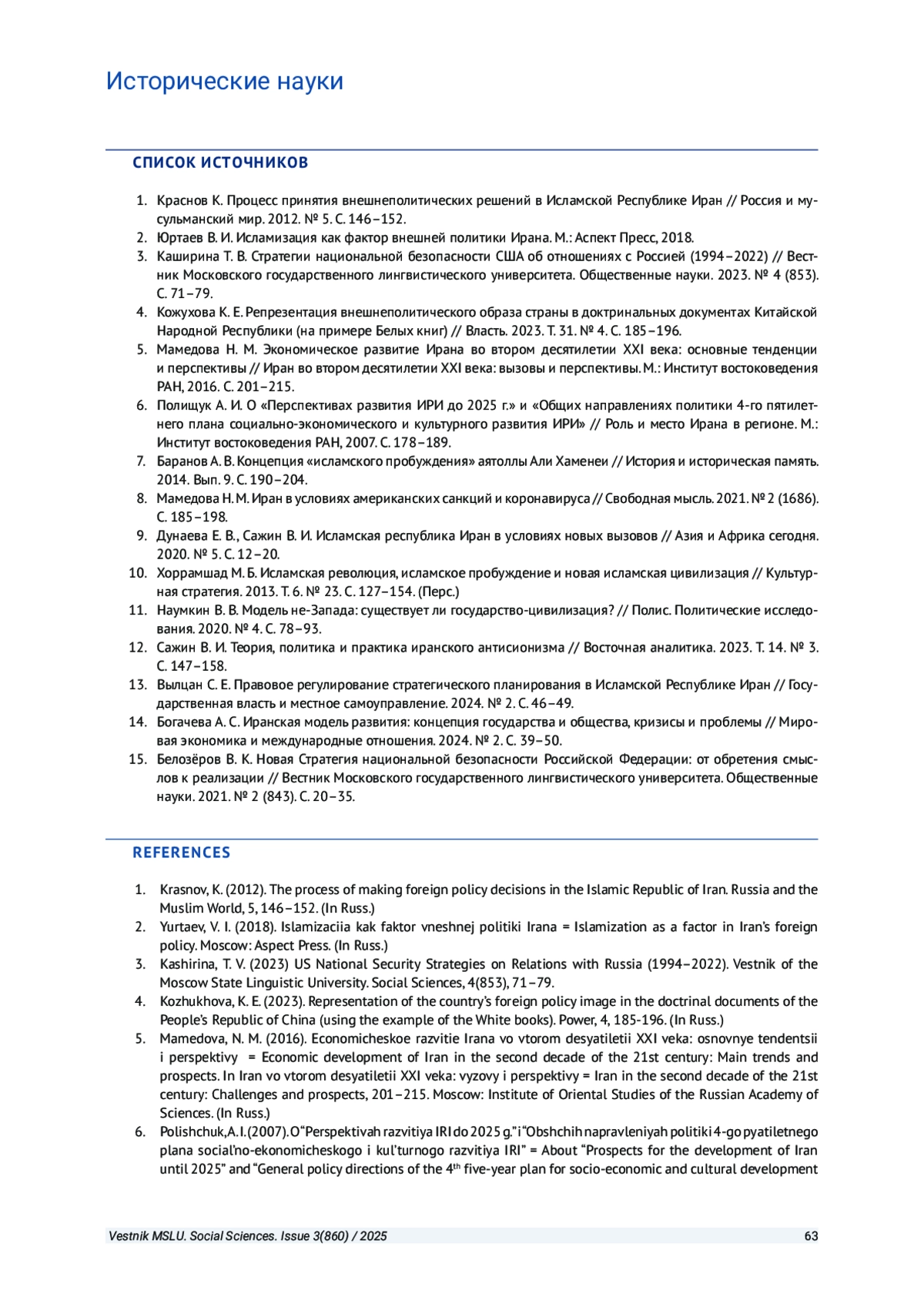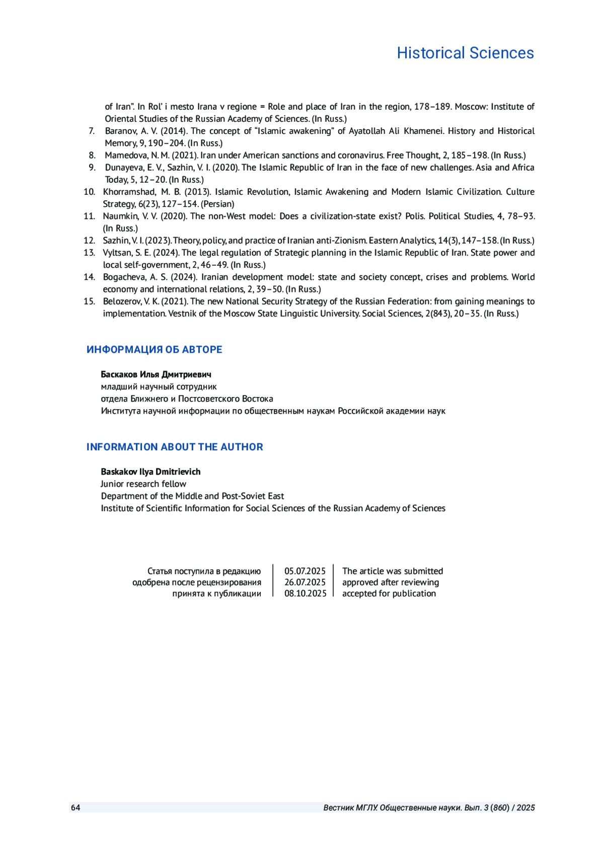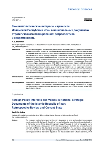 БАСКАКОВ И. Д. ВНЕШНЕПОЛИТИЧЕСКИЕ ИНТЕРЕСЫ И ЦЕННОСТИ ИСЛАМСКОЙ РЕСПУБЛИКИ ИРАН В НАЦИОНАЛЬНЫХ ДОКУМЕНТАХ СТРАТЕГИЧЕСКОГО ПЛАНИРОВАНИЯ: РЕТРОСПЕКТИВА И СОВРЕМЕННОСТЬ // ВЕСТНИК МОСКОВСКОГО ГОСУДАРСТВЕННОГО ЛИНГВИСТИЧЕСКОГО УНИВЕРСИТЕТА. ОБЩЕСТВЕННЫЕ НАУКИ. 2025. № 3 (860)