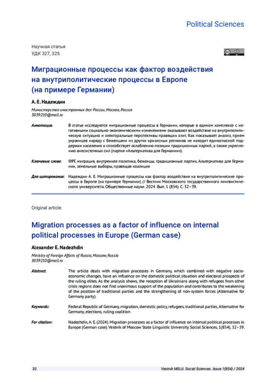 В статье исследуются миграционные процессы в Германии, которые в едином комплексе с негативными социально-экономическими изменениями оказывают воздействие на внутриполитическую ситуацию и электоральные перспективы правящих элит. Как показывает анализ, прием украинцев наряду с беженцами из других кризисных регионов не находит единогласной поддержки населения и способствует ослаблению позиции традиционных партий, а также укреплению внесистемных сил (партия «Альтернатива для Германии»).