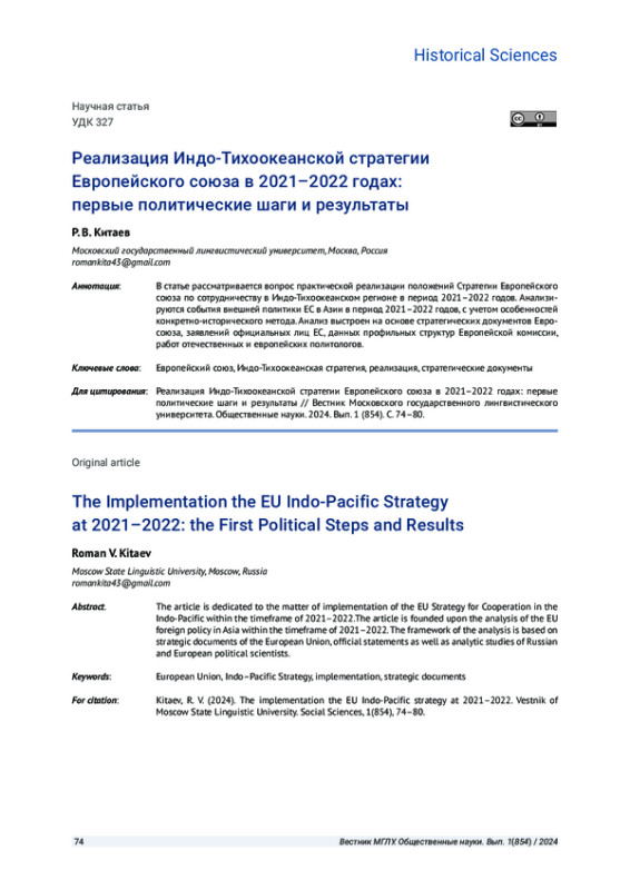 В статье рассматривается вопрос практической реализации положений Стратегии Европейского союза по сотрудничеству в Индо-Тихоокеанском регионе в период 2021-2022 годов. Анализируются события внешней политики ЕС в Азии в период 2021-2022 годов, с учетом особенностей конкретно-исторического метода. Анализ выстроен на основе стратегических документов Евросоюза, заявлений официальных лиц ЕС, данных профильных структур европейской комиссии, работ отечественных и европейских политологов.