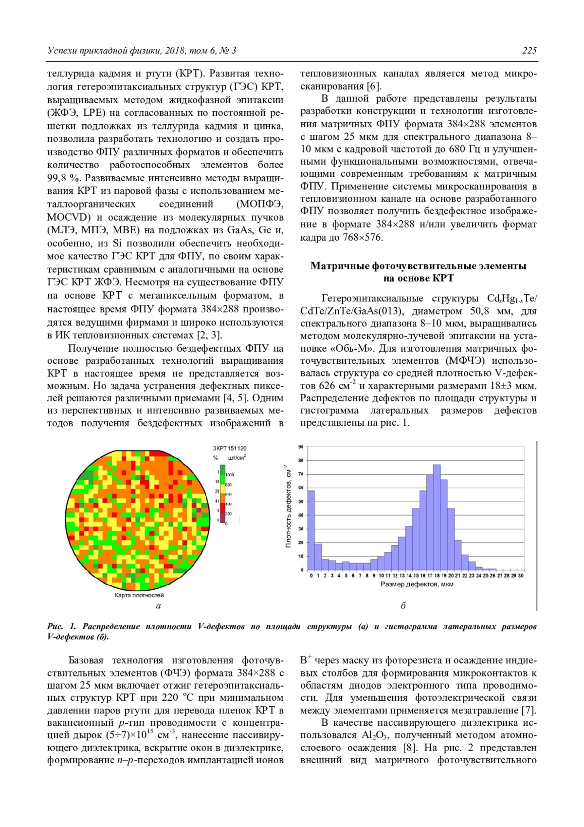 Разработана конструкция и изготовлены матричные ФЧЭ форматом 384288 элементов с шагом 25 мкм с длинноволновой границей чувствительности по уровню 0,5 около 9,5 мкм. Средняя величина R0А фотодиодов по всему массиву матрицы равна 100 Ом см2. Разработаны схема и топология, по которым изготовлены матричные высокоскоростные мультиплексоры форматом 384288 элементов с шагом 25 мкм, обеспечивающие рабочие режимы на тактовой частоте до 20 МГц. Методом гибридной сборки на индиевых столбах изготовлено матричное ФПУ форматом 384288 элементов с шагом 25 мкм с параметрами: средняя величина NETD < 30 мК, количество работоспособных элементов > 97 %. Использование мезатравления для разделения отдельных фотодиодов снижает фотоэлектрическую связь и обеспечивает высокое пространственное разрешение матричного ФПУ, равное 11,25 штр/мм. Представлены примеры использования системы микросканирования для снижения дефектных пикселов в кадре изображения и/или увеличения формата кадров до 768576. Показано, что в результате использования микросканирования в тепловизионном канале на основе разработанного ФПУ при переходе к формату 768576 получено улучшение пространственного разрешения в 1,4 раза при одинаковой величине минимально разрешаемой разности температур (МРРТ), а МРРТ на частоте 0,44 мрад-1 уменьшается с 1,6 К до 0,9 К по сравнению с исходным форматом 384×288.