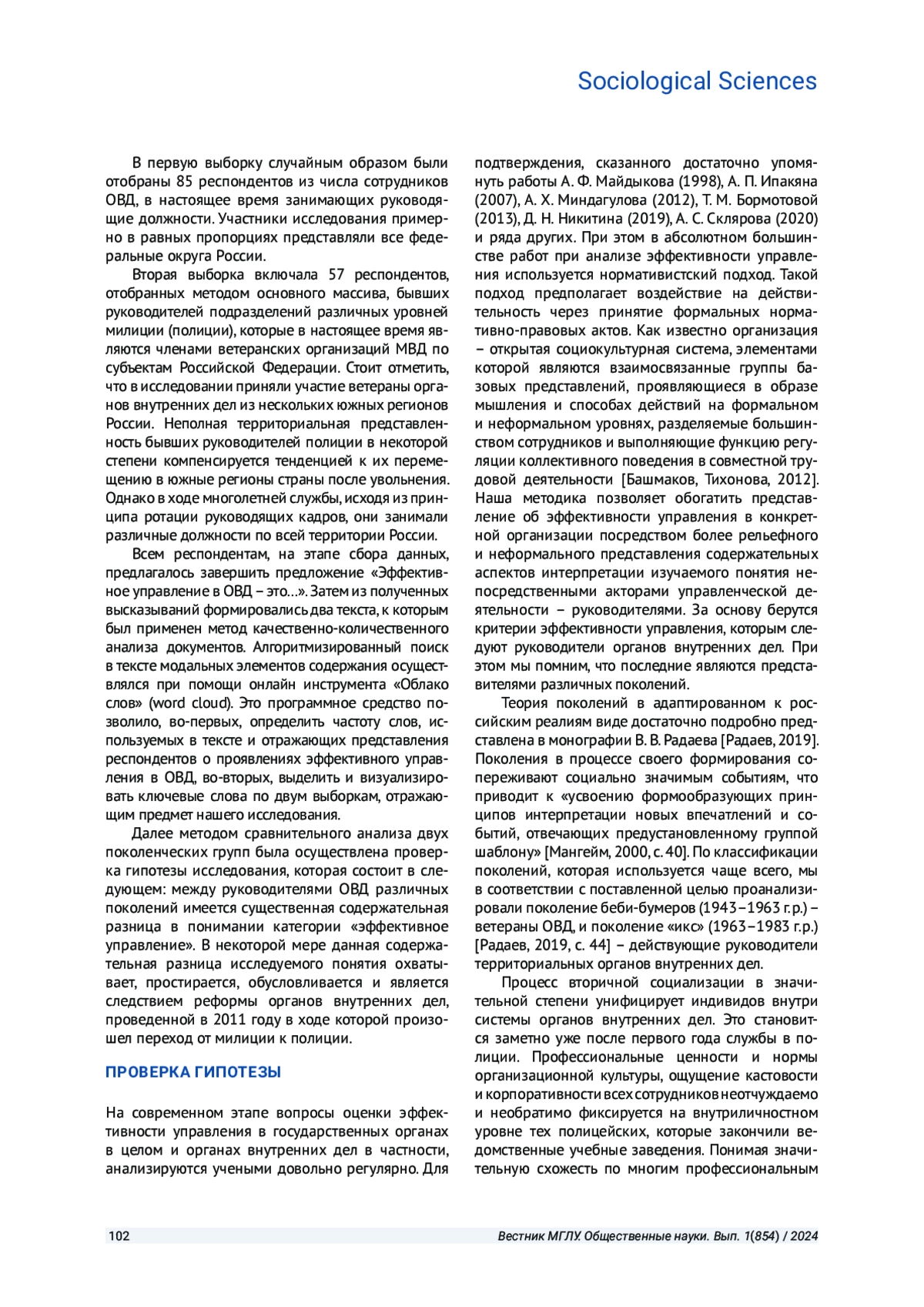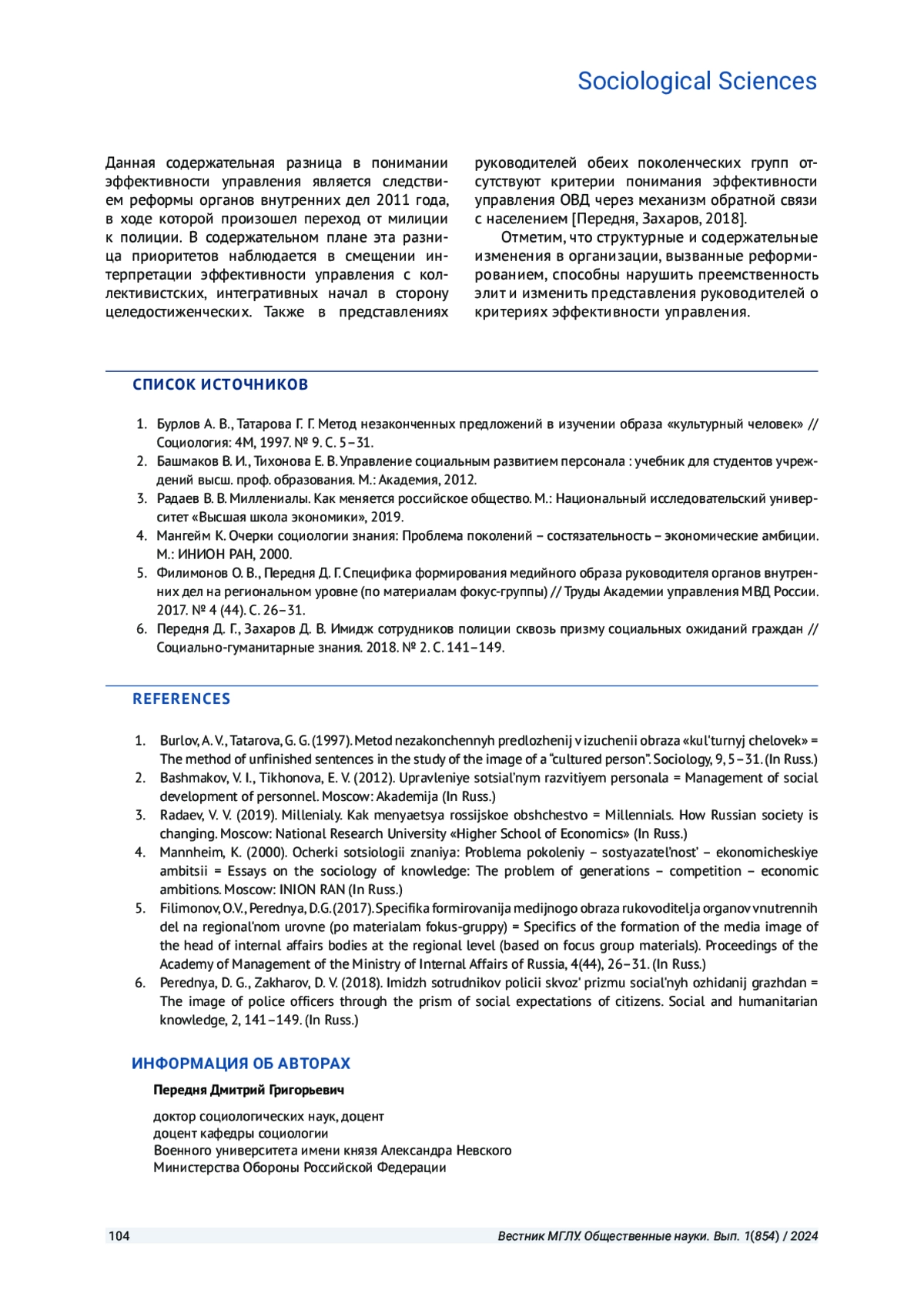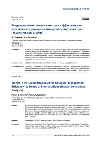 ПЕРЕДНЯ Д. Г., ПОГРЕБНОЙ Д. Н. ТЕНДЕНЦИИ ОБЪЕКТИВАЦИИ КАТЕГОРИИ "ЭФФЕКТИВНОСТЬ УПРАВЛЕНИЯ" РУКОВОДИТЕЛЯМИ ОРГАНОВ ВНУТРЕННИХ ДЕЛ (ПОКОЛЕНЧЕСКИЙ АНАЛИЗ) // ВЕСТНИК МОСКОВСКОГО ГОСУДАРСТВЕННОГО ЛИНГВИСТИЧЕСКОГО УНИВЕРСИТЕТА. ОБЩЕСТВЕННЫЕ НАУКИ. 2024. № 1 (854)