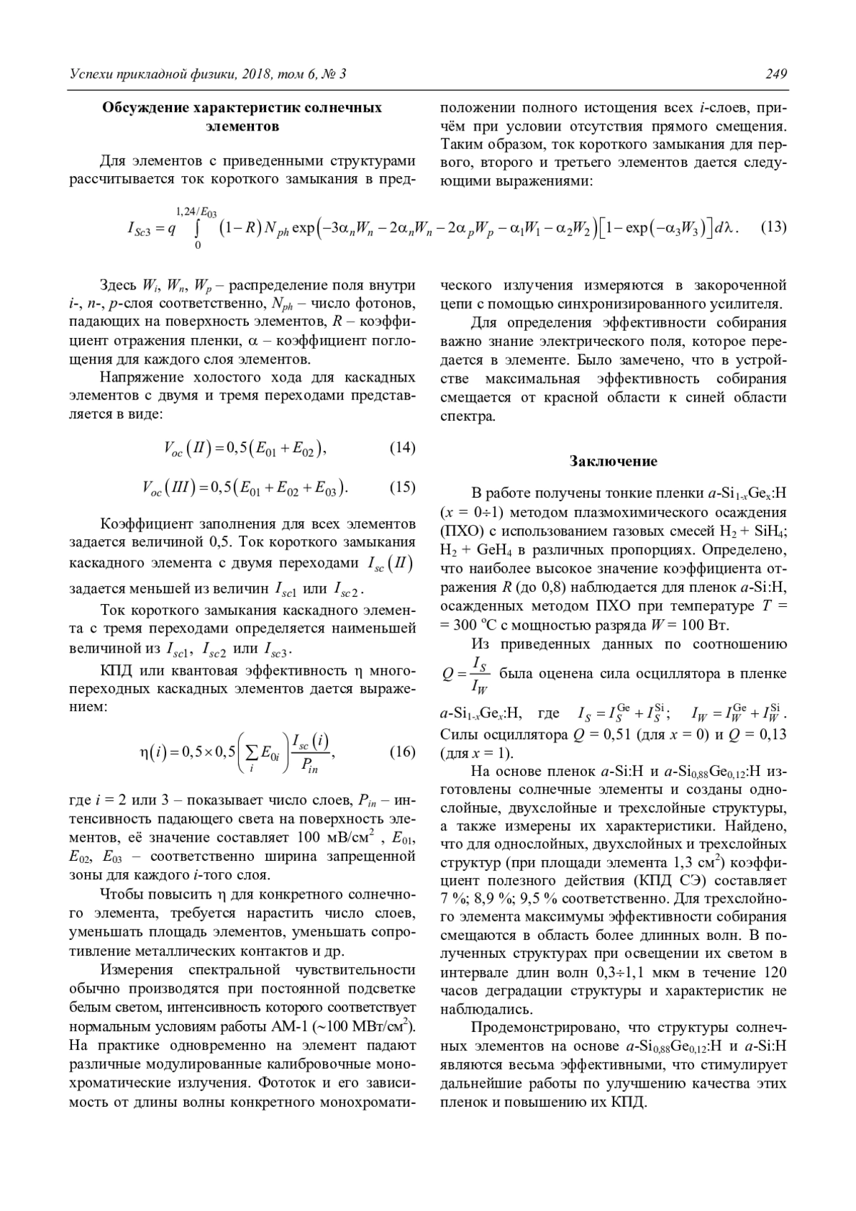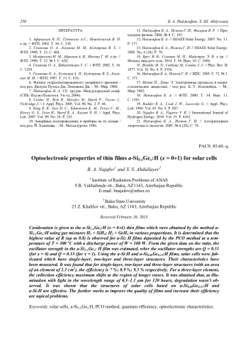 НАДЖАФОВ Б. А., АБДУЛЛАЕВ Х. Ш. ОПТОЭЛЕКТРОННЫЕ СВОЙСТВА ТОНКИХ ПЛЕНОК А-SI1-XGEX: H (X = 0÷1) ДЛЯ СОЛНЕЧНЫХ ЭЛЕМЕНТОВ // УСПЕХИ ПРИКЛАДНОЙ ФИЗИКИ. 2018. ТОМ 6, №3