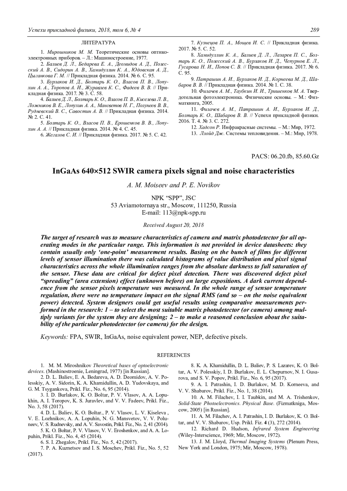 Статья: Сигнальные и шумовые характеристики элементов МФПУ формата 640512 SWIR-диапазона (2018)