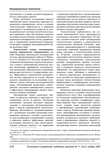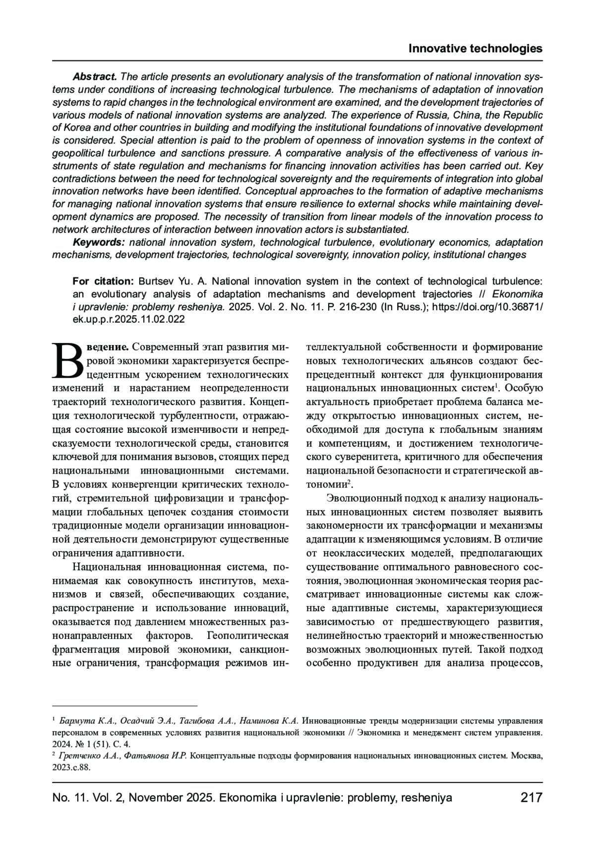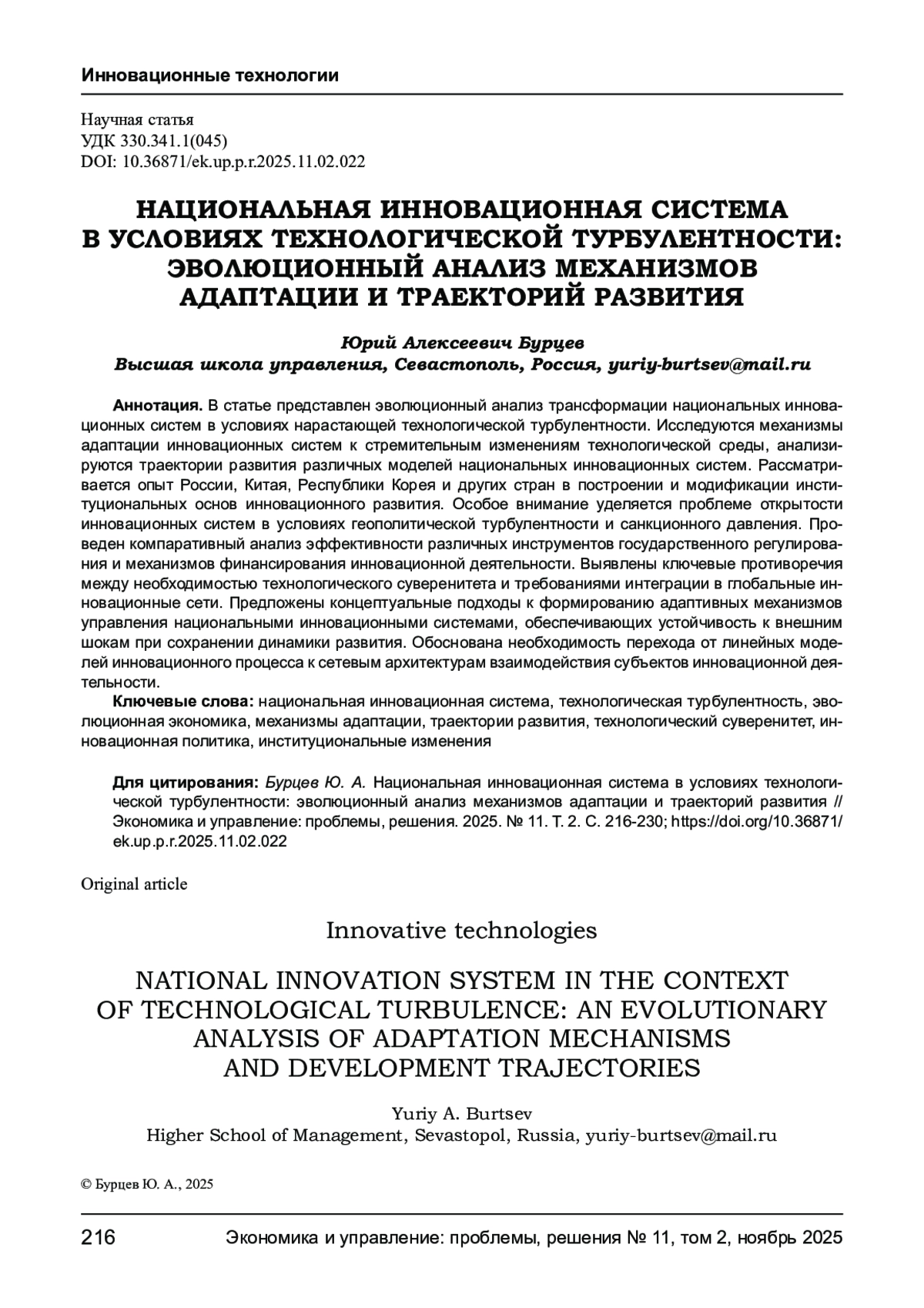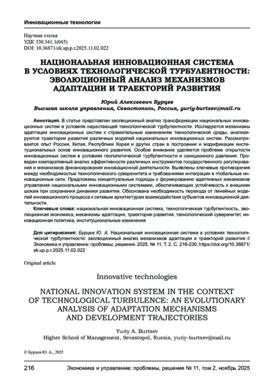 БУРЦЕВ Ю. А. НАЦИОНАЛЬНАЯ ИННОВАЦИОННАЯ СИСТЕМА В УСЛОВИЯХ ТЕХНОЛОГИЧЕСКОЙ ТУРБУЛЕНТНОСТИ: ЭВОЛЮЦИОННЫЙ АНАЛИЗ МЕХАНИЗМОВ АДАПТАЦИИ И ТРАЕКТОРИЙ РАЗВИТИЯ // ЭКОНОМИКА И УПРАВЛЕНИЕ: ПРОБЛЕМЫ, РЕШЕНИЯ. 2025. ТОМ 2 № 11