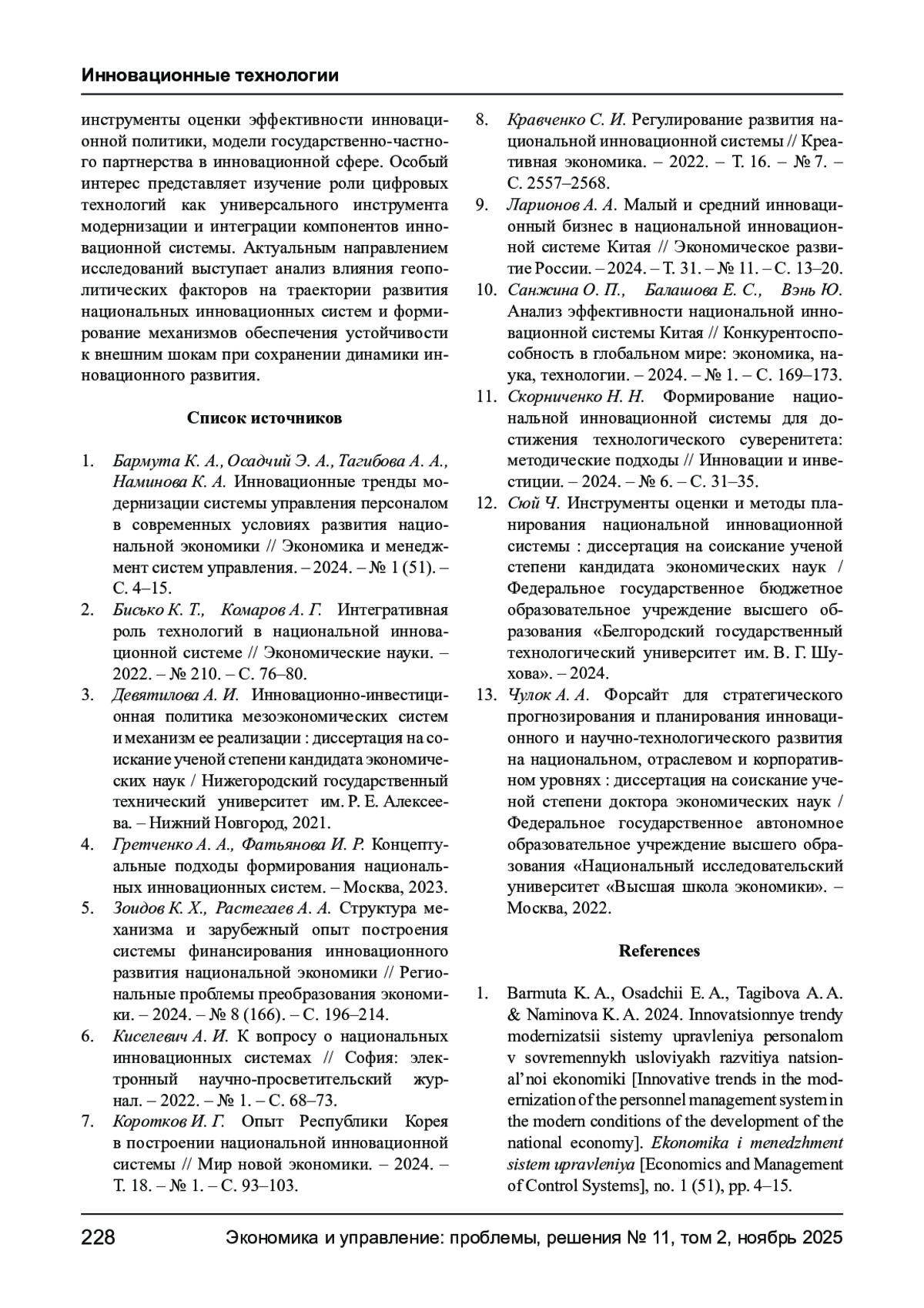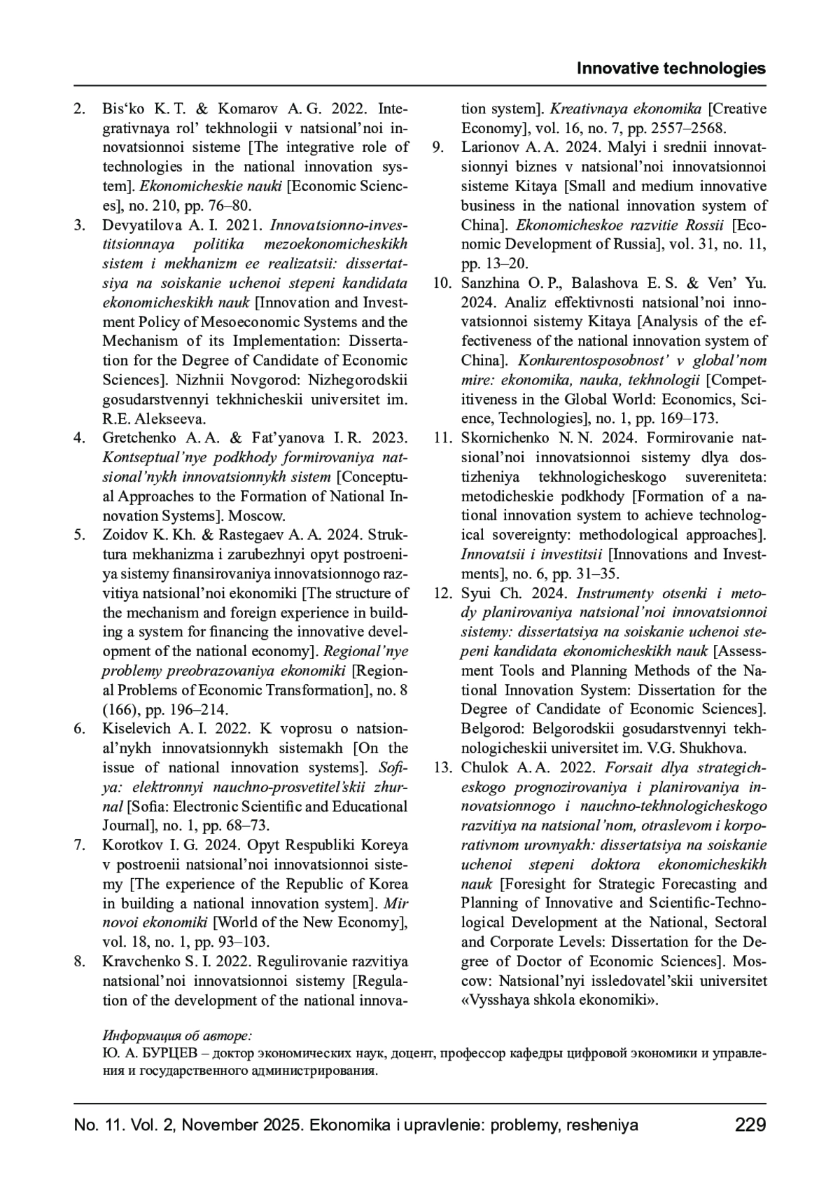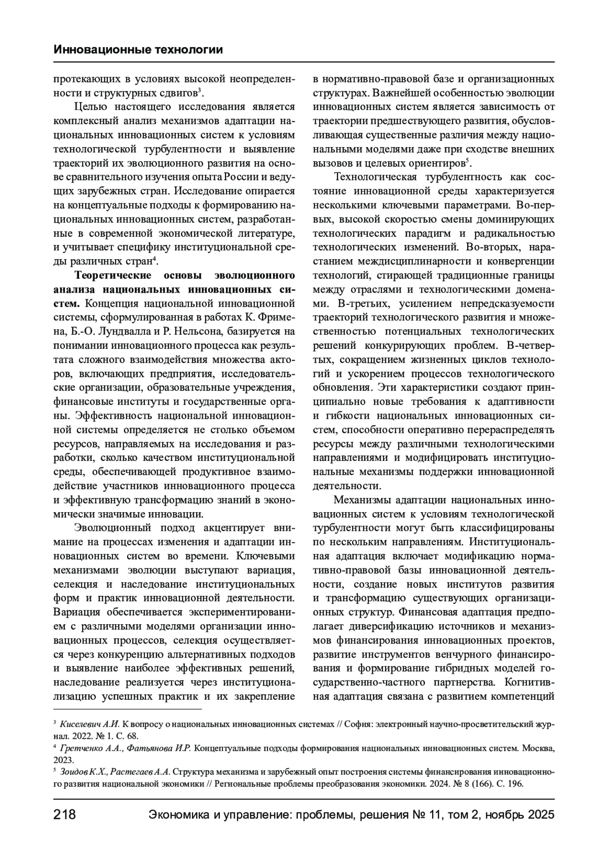 БУРЦЕВ Ю. А. НАЦИОНАЛЬНАЯ ИННОВАЦИОННАЯ СИСТЕМА В УСЛОВИЯХ ТЕХНОЛОГИЧЕСКОЙ ТУРБУЛЕНТНОСТИ: ЭВОЛЮЦИОННЫЙ АНАЛИЗ МЕХАНИЗМОВ АДАПТАЦИИ И ТРАЕКТОРИЙ РАЗВИТИЯ // ЭКОНОМИКА И УПРАВЛЕНИЕ: ПРОБЛЕМЫ, РЕШЕНИЯ. 2025. ТОМ 2 № 11