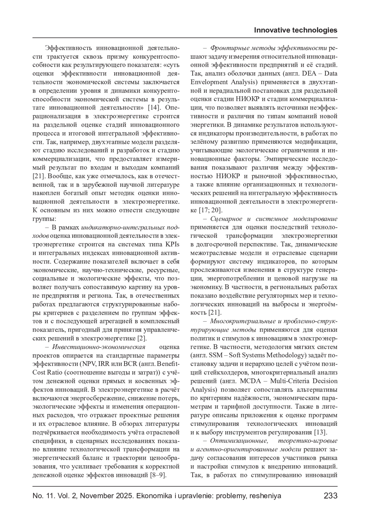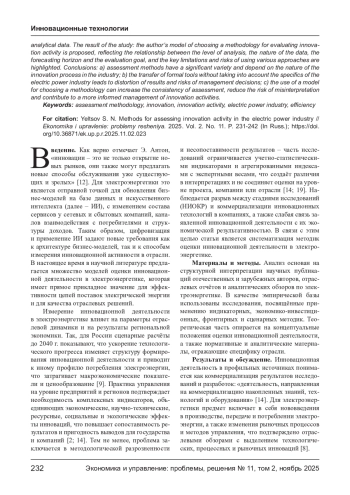 Выводы: а) методики оценки обладают значительным разнообразием и зависят от характера инновационного процесса в отрасли; б) перенос формальных инструментов вне учёта специфики электроэнергетики приводит к искажению результатов и рискам управленческих решений; в) использование модели выбора методики может повысить согласованность оценки, снижать риск ошибочной интерпретации и способствовать более обоснованному управлению инновационной деятельностью.