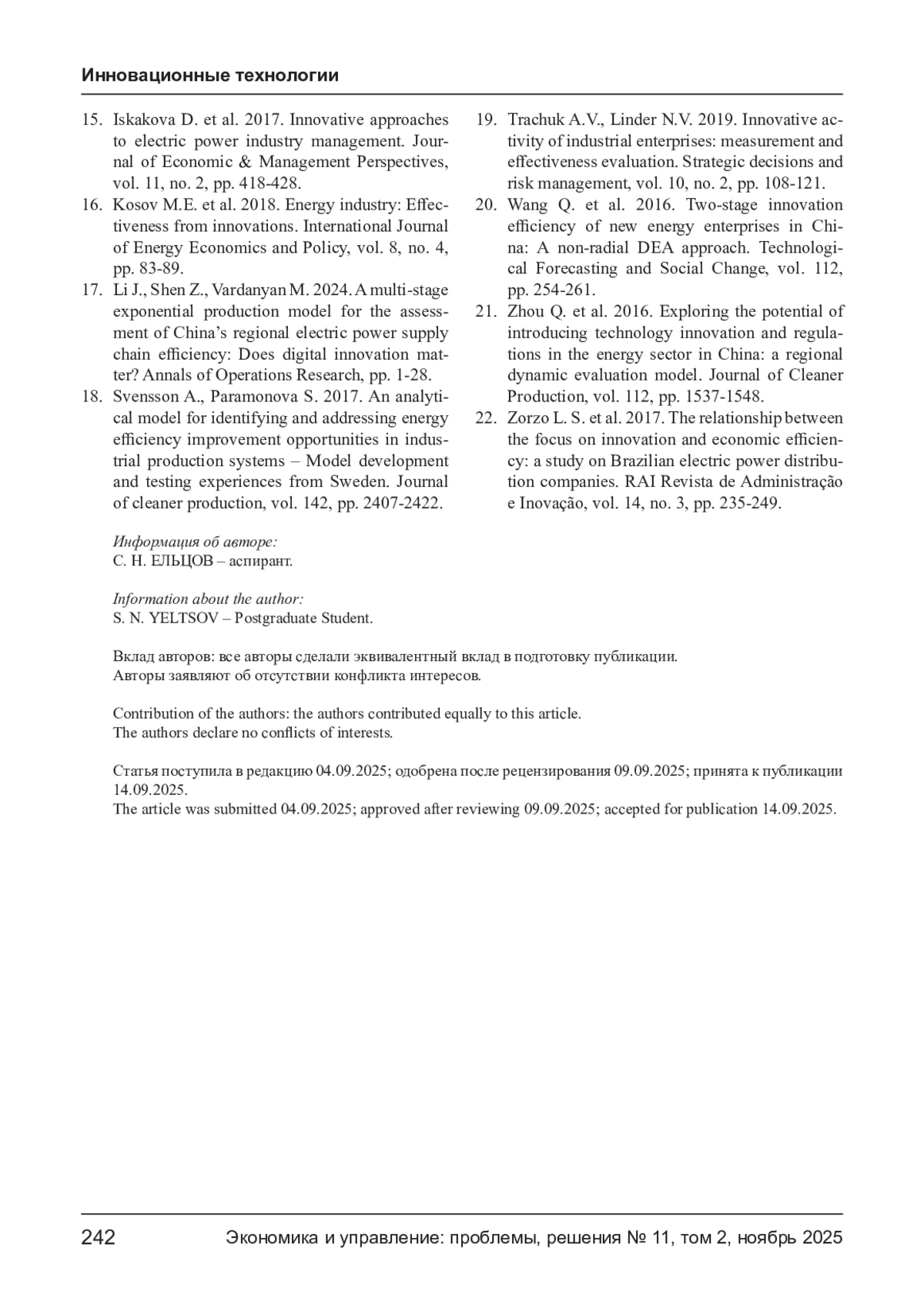 14. Gusev V. [et al.] Methods for assessing the efficiency of innovation activity of enterprises of the electric power industry // MATEC Web of Conferences. - EDP Sciences, 2018. - Vol. 170. - P. 1-8. EDN: YBUZRJ