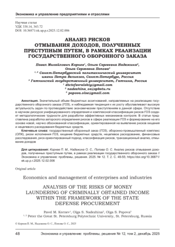 Значительный объем бюджетных ассигнований, направляемых на реализацию государственного оборонного заказа (ГОЗ), и наблюдаемая тенденция к их росту обуславливают высокую актуальность задач по противодействию экономическим преступлениям в данной сфере. Отсутствие в научном дискурсе унифицированного определения и комплексной классификации рисков ГОЗ создает методологические трудности для разработки эффективных механизмов контроля. В статье представлена разработка авторского определения рисков в сфере реализации ГОЗ и формирование на его основе новой, научно обоснованной классификации, ориентированной на выявление рисков хищения и нецелевого расходования бюджетных средств.