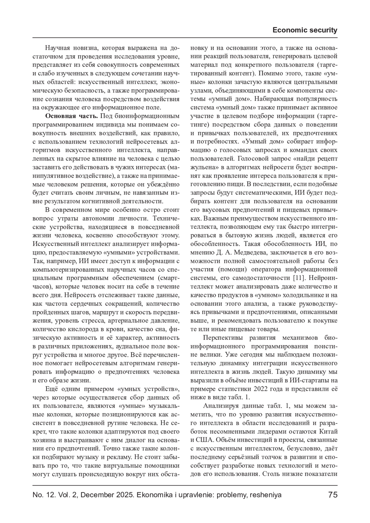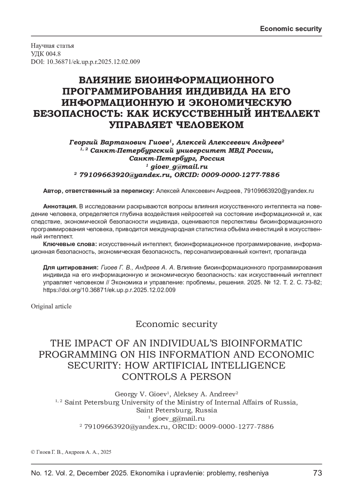 В исследовании раскрываются вопросы влияния искусственного интеллекта на поведение человека, определяется глубина воздействия нейросетей на состояние информационной и, как следствие, экономической безопасности индивида, оцениваются перспективы биоинформационного программирования человека, приводится международная статистика объёма инвестиций в искусственный интеллект.