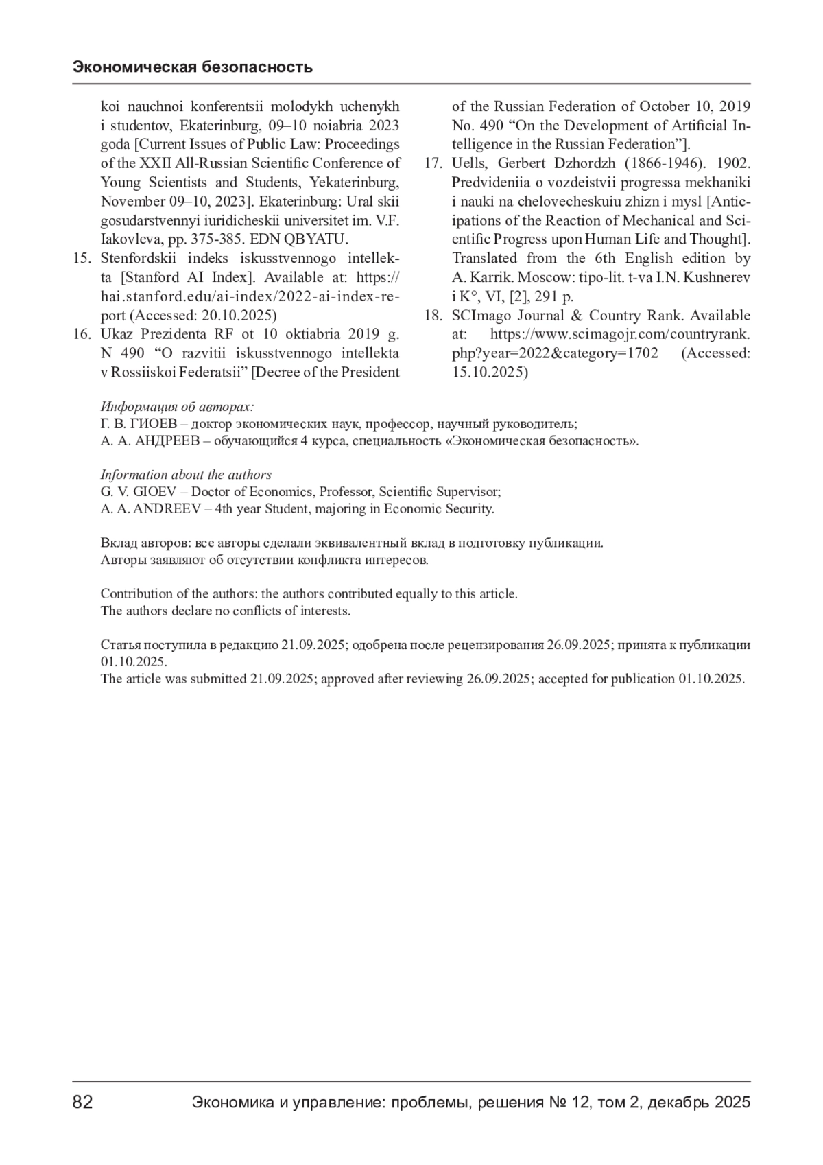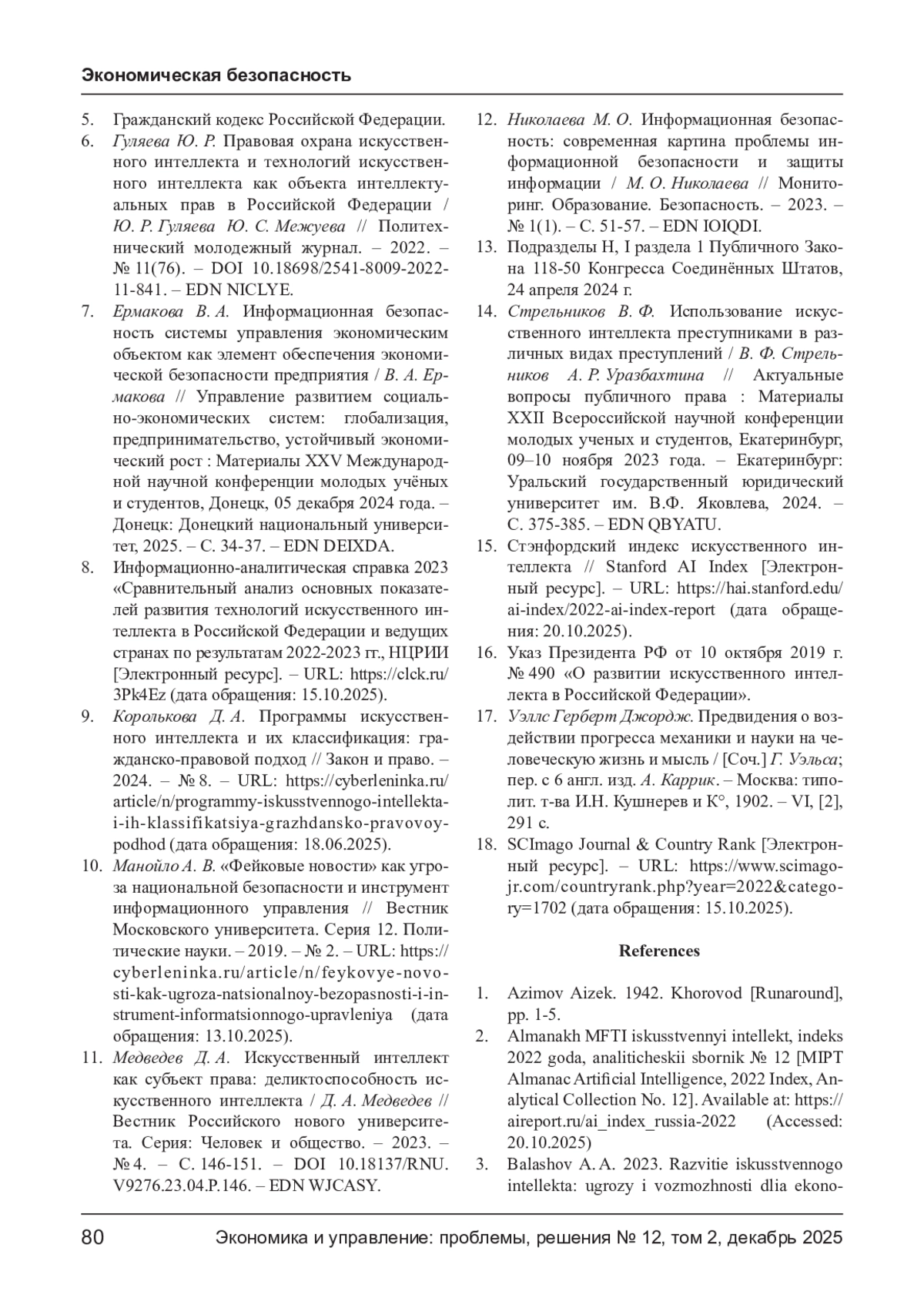 3. Балашов А. А. Развитие искусственного интеллекта: угрозы и возможности для экономической безопасности России // МНИЖ. - 2023. - № 10 (136).