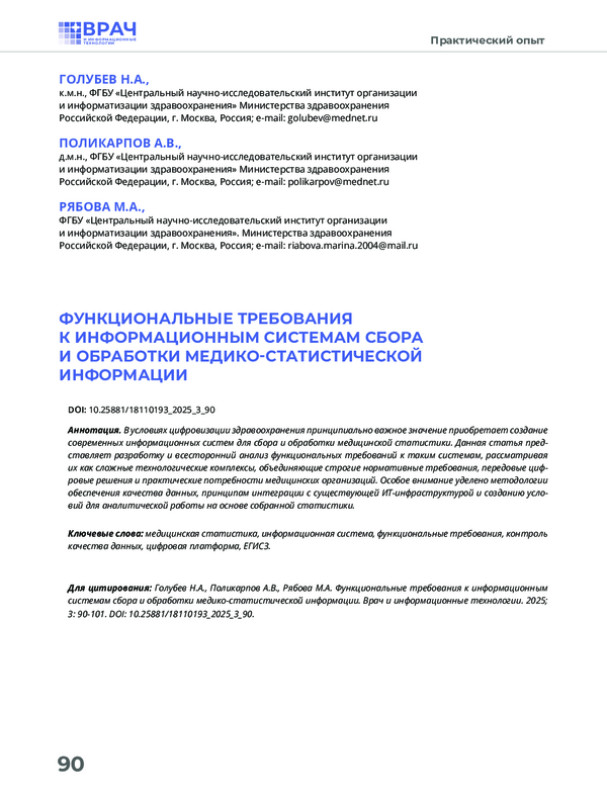 ПОЛИКАРПОВ А. В., ГОЛУБЕВ Н. А., РЯБОВА М.А. ФУНКЦИОНАЛЬНЫЕ ТРЕБОВАНИЯ К ИНФОРМАЦИОННЫМ СИСТЕМАМ СБОРА И ОБРАБОТКИ МЕДИКО-СТАТИСТИЧЕСКОЙ ИНФОРМАЦИИ // ВРАЧ И ИНФОРМАЦИОННЫЕ ТЕХНОЛОГИИ. 2025. № 3