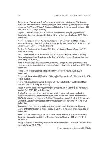 57. Savel’eva I.M., Poletaev A.V. O pol’ze i vrede prezentizma v istoriografii [The Benefits and Harms of Presentism in Historiography], in “Tsep’ vremen”: problemy istoricheskogo soznaniya [The “Chain of Times”: Problems of Historical Consciousness]. Moscow: IGH RAN, 2005. Pp. 63-88 (in Russian).