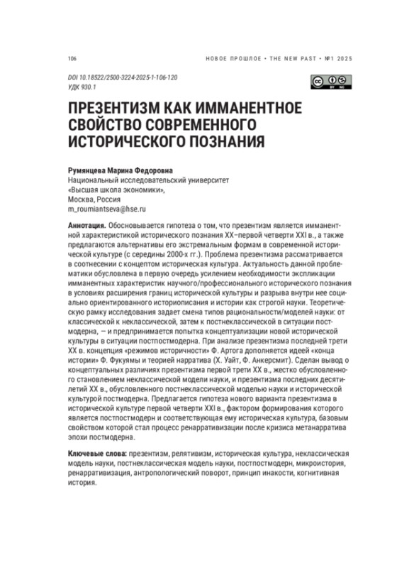 Обосновывается гипотеза о том, что презентизм является имманентной характеристикой исторического познания XX–первой четверти XXI в., а также предлагаются альтернативы его экстремальным формам в современной исторической культуре (с середины 2000-х гг.). Проблема презентизма рассматривается в соотнесении с концептом историческая культура. Актуальность данной проблематики обусловлена в первую очередь усилением необходимости экспликации имманентных характеристик научного/профессионального исторического познания в условиях расширения границ исторической культуры и разрыва внутри нее социально ориентированного историописания и истории как строгой науки. Теоретическую рамку исследования задает смена типов рациональности/моделей науки: от классической к неклассической, затем к постнеклассической в ситуации постмодерна, — и предпринимается попытка концептуализации новой исторической культуры в ситуации постпостмодерна. При анализе презентизма последней трети XX в. концепция «режимов историчности» Ф. Артога дополняется идеей «конца истории» Ф. Фукуямы и теорией нарратива (Х. Уайт, Ф. Анкерсмит). Сделан вывод о концептуальных различиях презентизма первой трети XX в., жестко обусловленного становлением неклассической модели науки, и презентизма последних десятилетий XX в., обусловленного постнеклассической моделью науки и исторической культурой постмодерна. Предлагается гипотеза нового варианта презентизма в исторической культуре первой четверти XXI в., фактором формирования которого является постпостмодерн и соответствующая ему историческая культура, базовым свойством которой стал процесс ренарративизации после кризиса метанарратива эпохи постмодерна