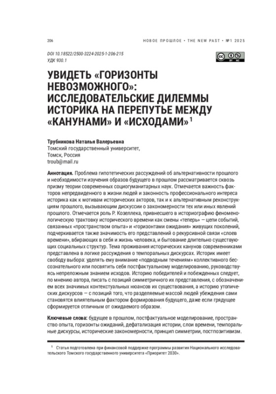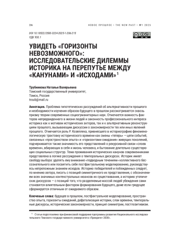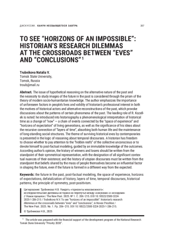 Проблема гипотетических рассуждений об альтернативности прошлого и необходимости изучения образов будущего в прошлом рассматривается сквозь призму теории современных социогуманитарных наук. Отмечается важность факторов непредвиденного в жизни людей и законность профессионального интереса историка как к мотивам исторических акторов, так и к альтернативным реконструкциям прошлого, вызывающим дискуссии о закономерности тех или иных явлений прошлого. Отмечается роль Р. Козеллека, привнесшего в историографию феноменологическую трактовку исторического времени как смены «теперь» — цепи событий, связанных «пространством опыта» и «горизонтами ожидания» живущих поколений, подчеркивается также значимость его представлений о рекурсивной связи «слоев времени», вбирающих в себя и жизнь человека, и бытование длительно существующих социальных структур. Тема проживания исторических канунов современниками представлена в логике рассуждения о темпоральных дискурсах. Историк имеет свободу выбора: уделять ему внимание «подводным течениям» коллективного бессознательного или посвятить себя постфактуальному моделированию, руководствуясь непреложным знанием исходов. Историю победителей и побежденных следует, по мнению автора, писать с позиций симметричного их представления, с обозначением всех значимых контекстуальных нюансов их существования, а историю утопических дискурсов — с позиций того, что разделяемые массой людей убеждения сами становятся влиятельным фактором формирования будущего, даже если грядущее сформируется отличным от ожидаемого образом