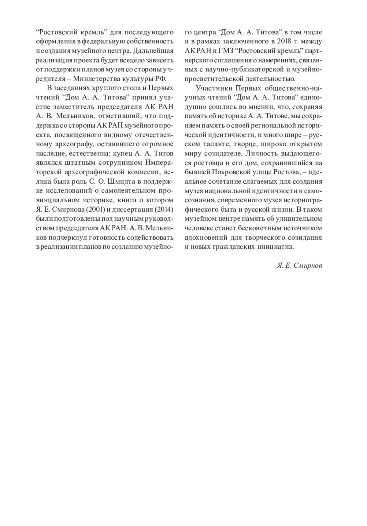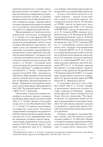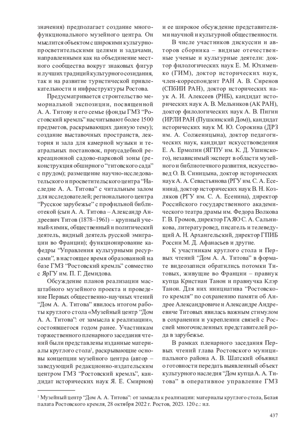 1. Музейный центр “Дом А. А. Титова”: от замысла к реализации: материалы круглого стола, Белая палата Ростовского кремля, 28 октября 2022 г. Ростов, 2023. 120 с.