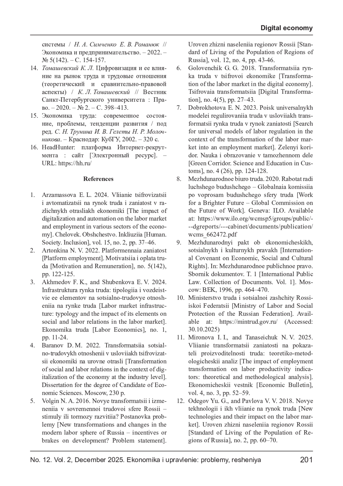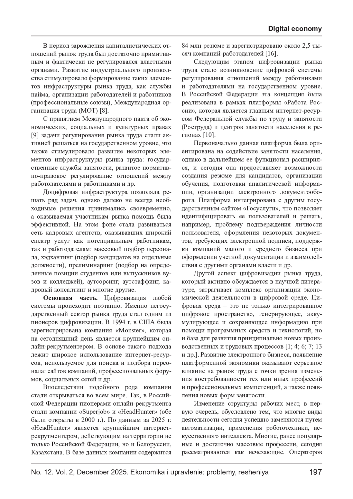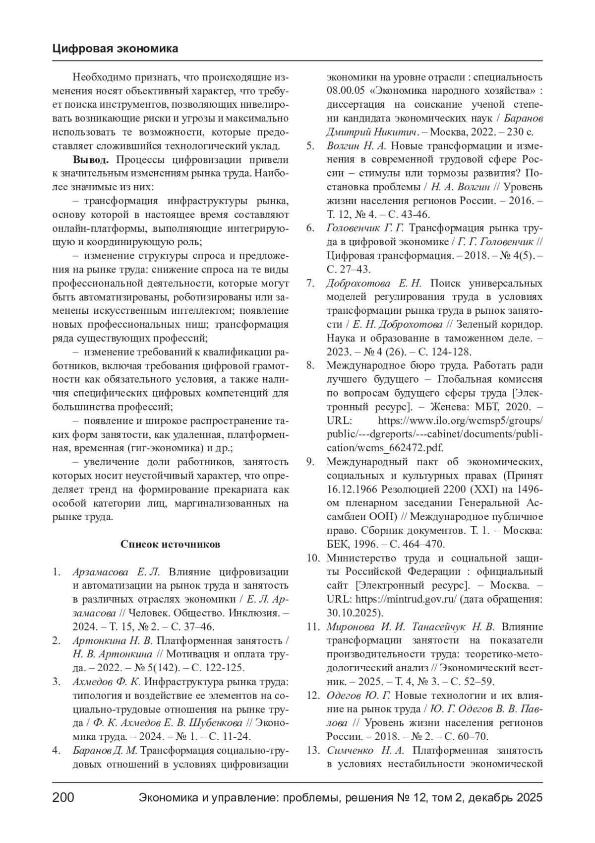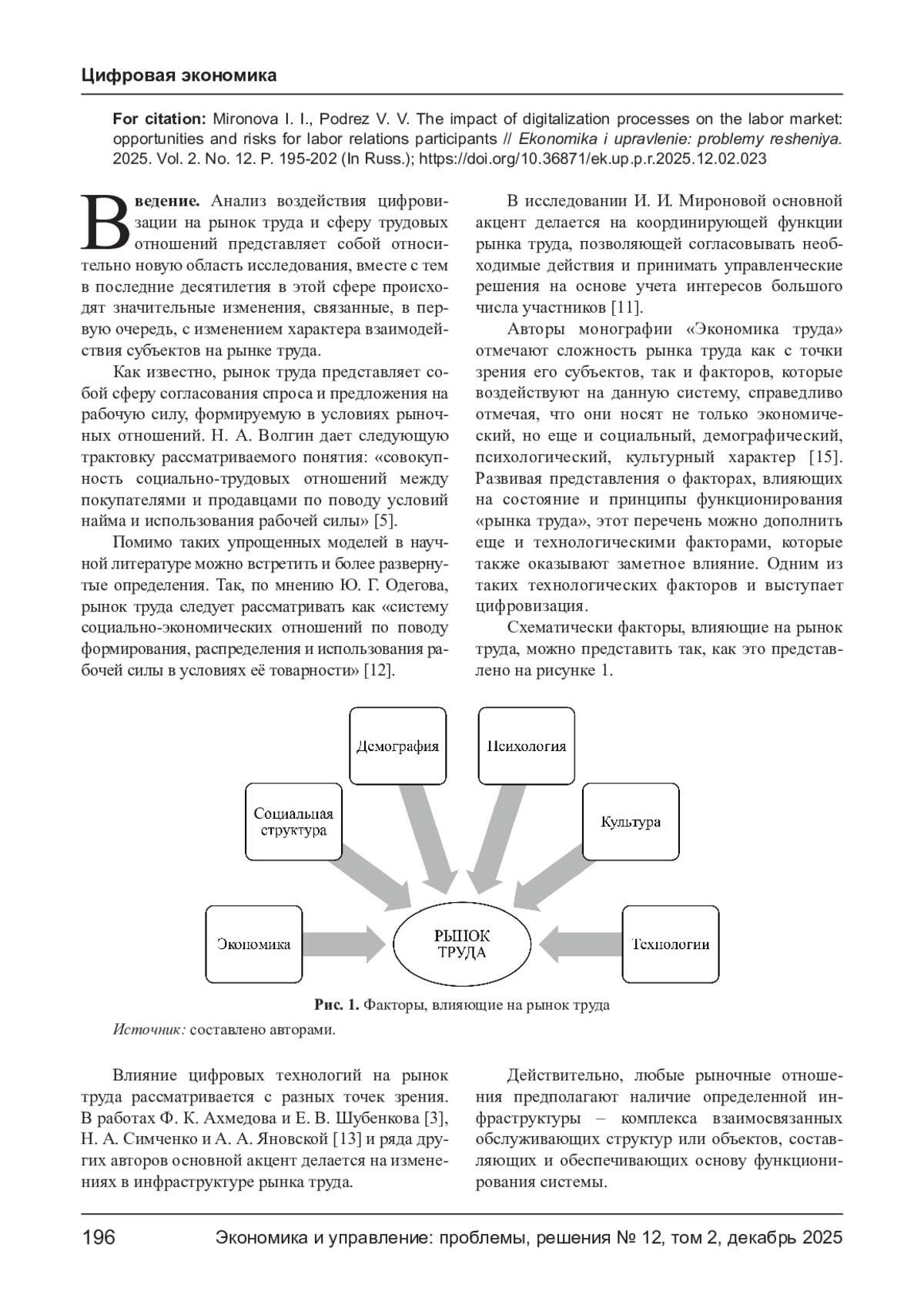 МИРОНОВА И. И., ПОДРЕЗ В. В. ВЛИЯНИЕ ПРОЦЕССОВ ЦИФРОВИЗАЦИИ НА РЫНОК ТРУДА: ВОЗМОЖНОСТИ И РИСКИ ДЛЯ УЧАСТНИКОВ ТРУДОВЫХ ОТНОШЕНИЙ // ЭКОНОМИКА И УПРАВЛЕНИЕ: ПРОБЛЕМЫ, РЕШЕНИЯ. 2025. ТОМ 12 № 2