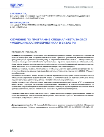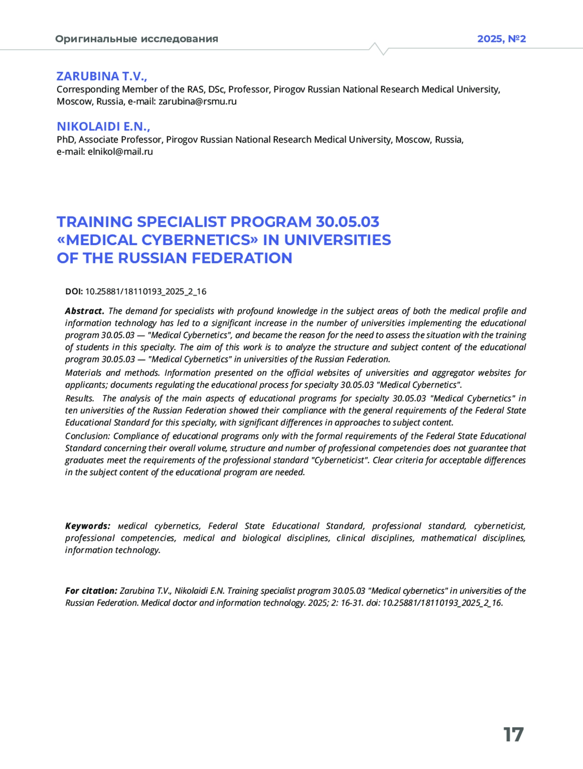 Востребованность специалистов, обладающих глубокими знаниями в предметных областях как медицинского профиля, так и информационных технологий, обусловила существенное увеличение количества вузов, реализующих образовательную программу по направлению подготовки 30.05.03 — «Медицинская кибернетика» и стала причиной необходимости оценки ситуации с обучением студентов по данной специальности. Целью работы является анализ структуры и предметного наполнения образовательной программы по направлению подготовки 30.05.03 «Медицинская кибернетика» в вузах Российской Федерации.