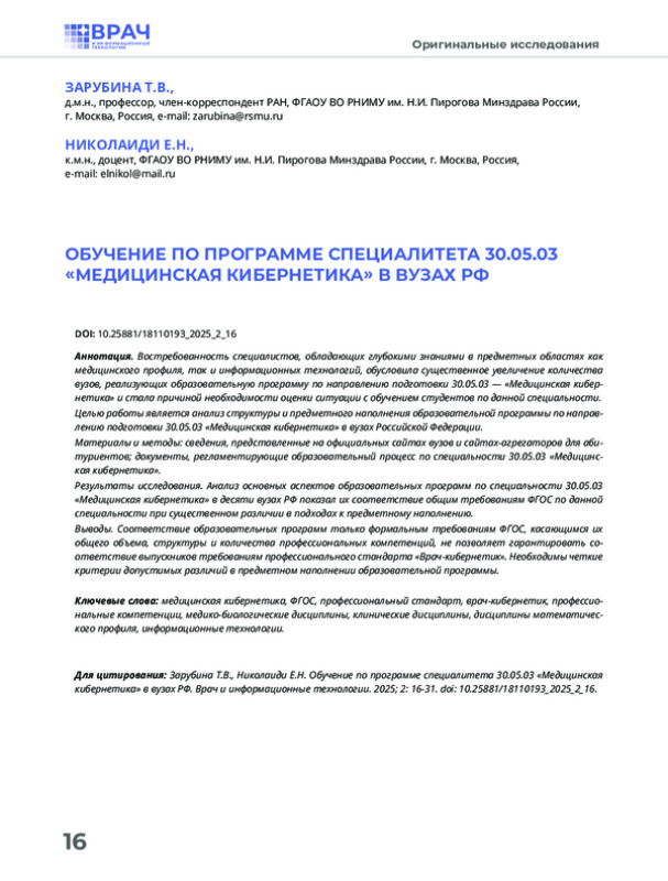 Результаты исследования. Анализ основных аспектов образовательных программ по специальности 30.05.03 «Медицинская кибернетика» в десяти вузах РФ показал их соответствие общим требованиям ФГОС по данной специальности при существенном различии в подходах к предметному наполнению.