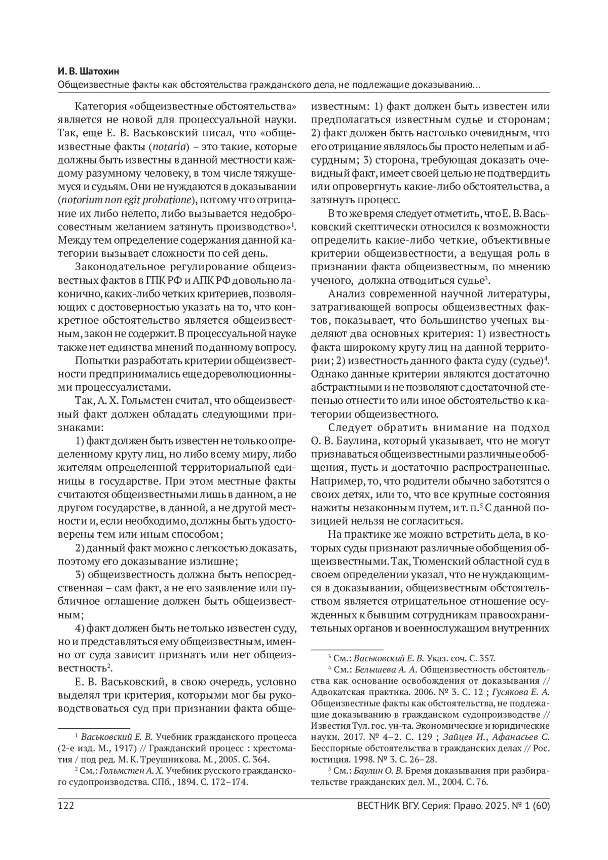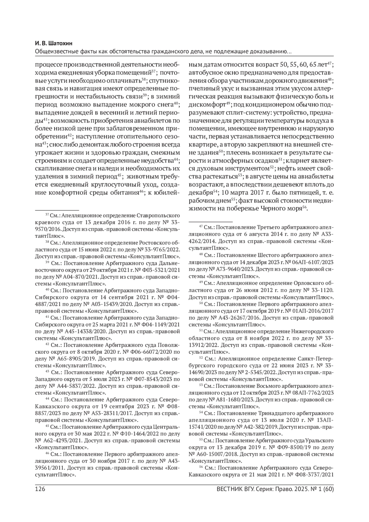 ШАТОХИН И.В. ОБЩЕИЗВЕСТНЫЕ ФАКТЫ КАК ОБСТОЯТЕЛЬСТВА ГРАЖДАНСКОГО ДЕЛА, НЕ ПОДЛЕЖАЩИЕ ДОКАЗЫВАНИЮ, В ПРАКТИКЕ РОССИЙСКИХ СУДОВ // ВЕСТНИК ВОРОНЕЖСКОГО ГОСУДАРСТВЕННОГО УНИВЕРСИТЕТА. СЕРИЯ: ПРАВО. 2025. № 1 (60)