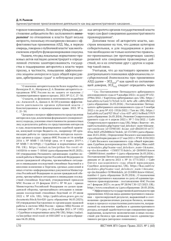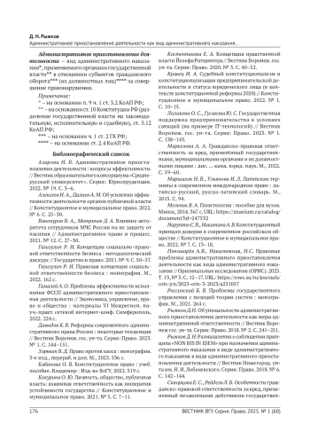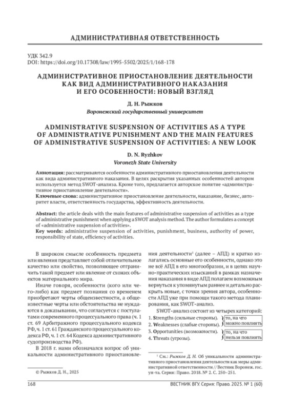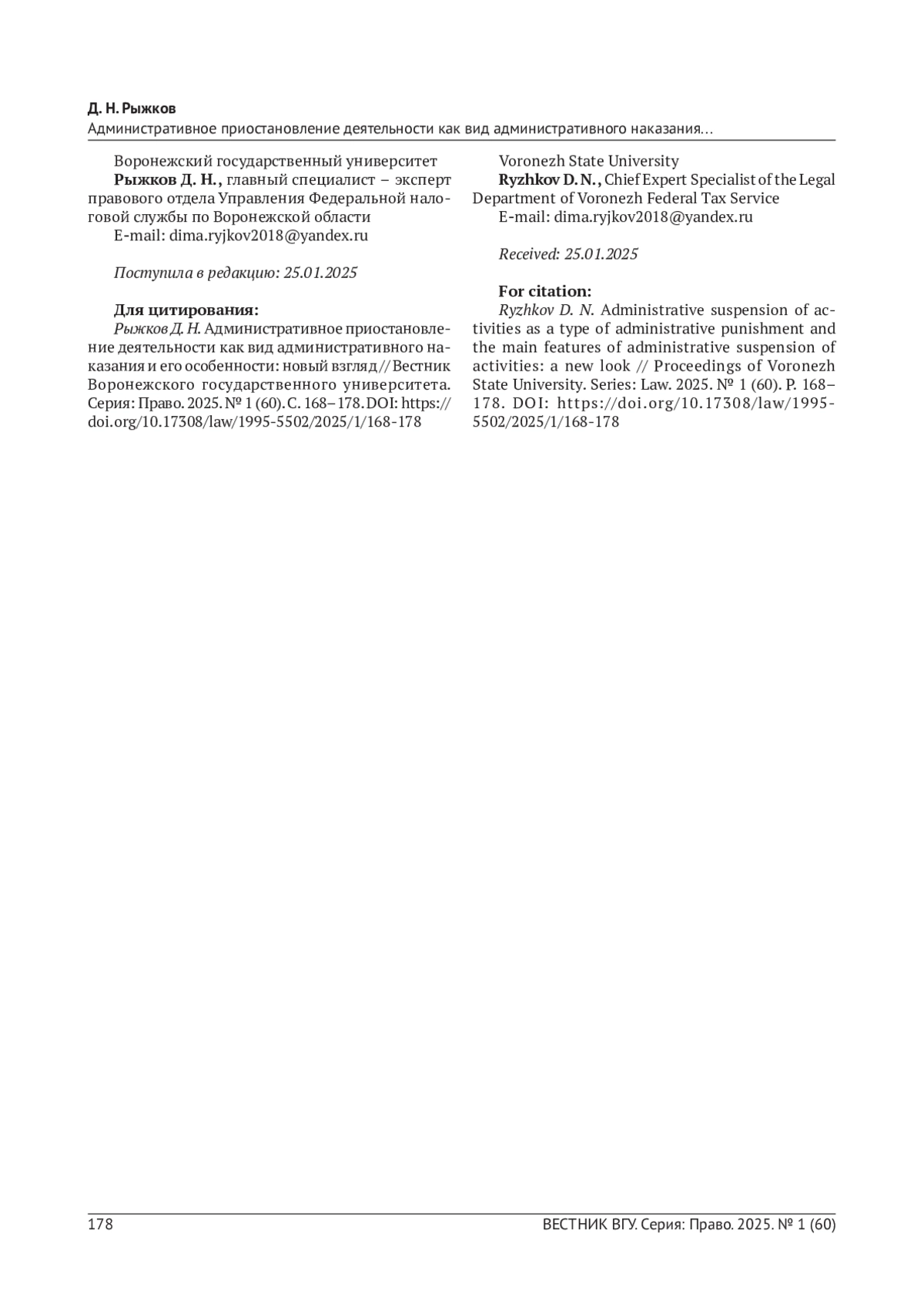 20. Рыжков Д.Н. Об уникальности административного приостановления деятельности как меры административной ответственности // Вестник Воронеж гос. ун-та. Серия: Право. 2018. № 2. С. 241-251. EDN: XVFKEX