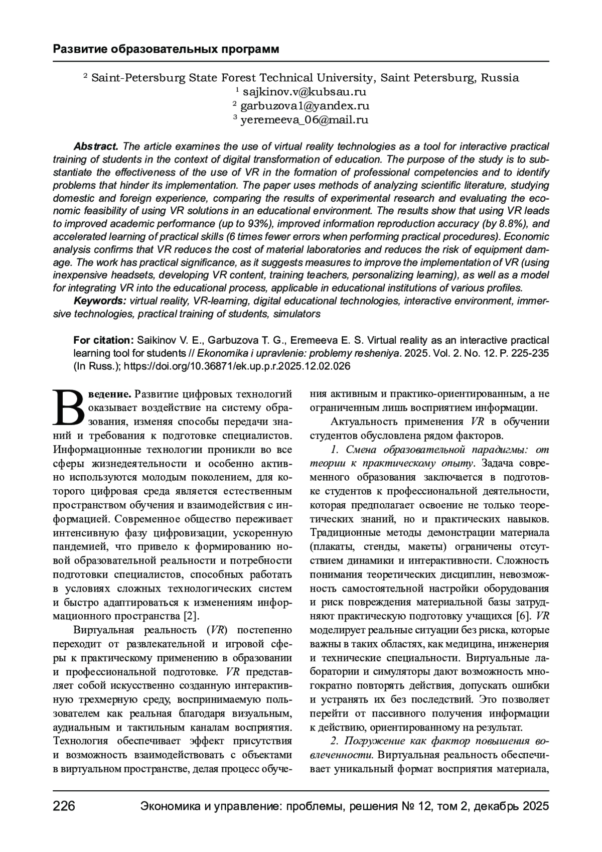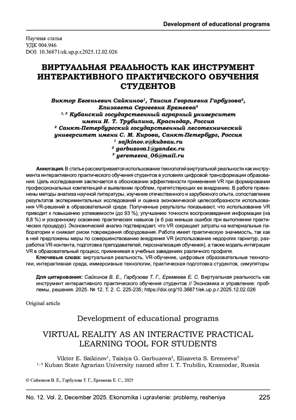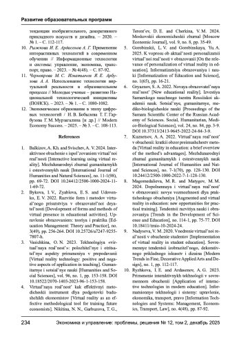 САЙКИНОВ В. Е., ГАРБУЗОВА Т. Г., ЕРЕМЕЕВА Е. С. ВИРТУАЛЬНАЯ РЕАЛЬНОСТЬ КАК ИНСТРУМЕНТ ИНТЕРАКТИВНОГО ПРАКТИЧЕСКОГО ОБУЧЕНИЯ СТУДЕНТОВ // ЭКОНОМИКА И УПРАВЛЕНИЕ: ПРОБЛЕМЫ, РЕШЕНИЯ. 2025. ТОМ 12 № 2