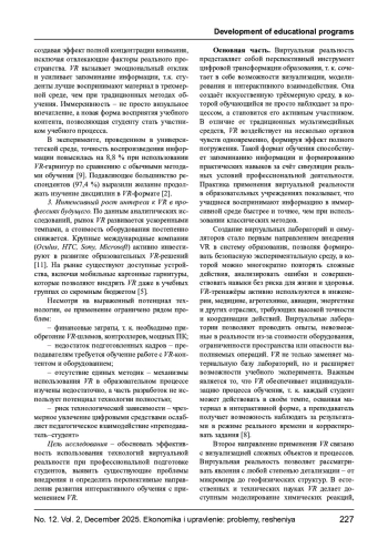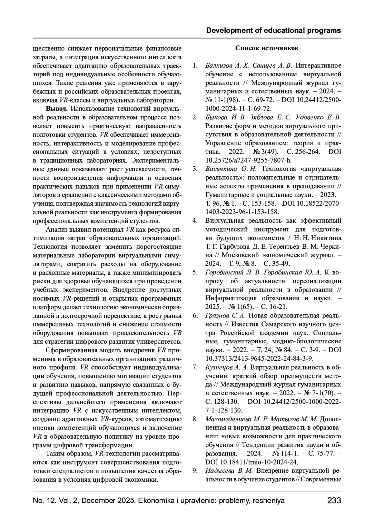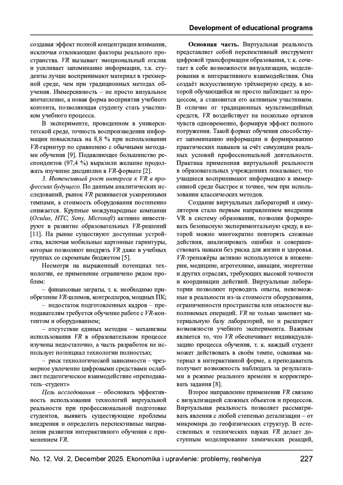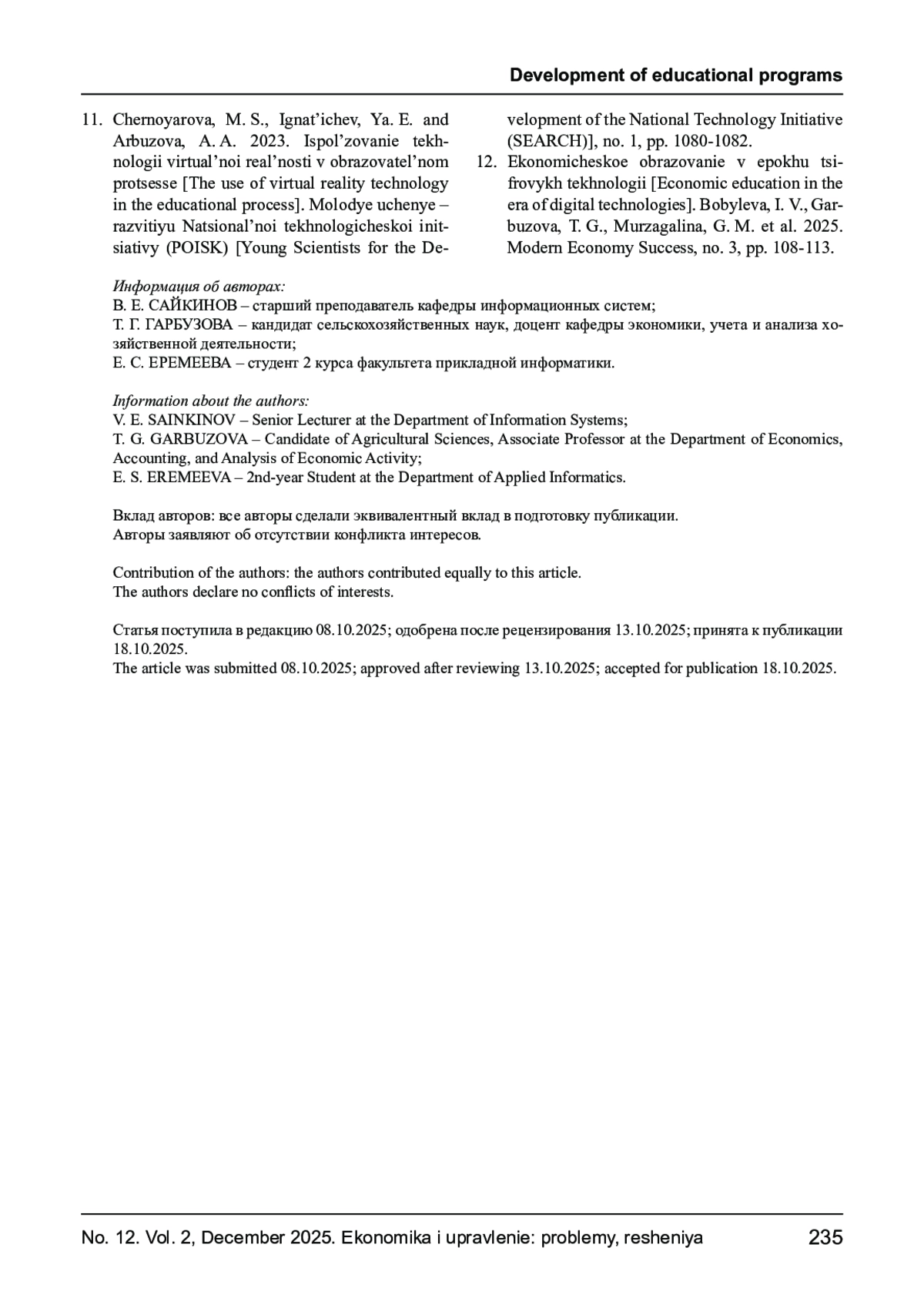 САЙКИНОВ В. Е., ГАРБУЗОВА Т. Г., ЕРЕМЕЕВА Е. С. ВИРТУАЛЬНАЯ РЕАЛЬНОСТЬ КАК ИНСТРУМЕНТ ИНТЕРАКТИВНОГО ПРАКТИЧЕСКОГО ОБУЧЕНИЯ СТУДЕНТОВ // ЭКОНОМИКА И УПРАВЛЕНИЕ: ПРОБЛЕМЫ, РЕШЕНИЯ. 2025. ТОМ 12 № 2