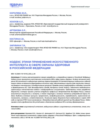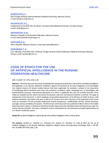 В статье рассматривается процесс разработки и утверждения первого в Российской Федерации Кодекса этики применения искусственного интеллекта (ИИ) в сфере охраны здоровья. На фоне активного внедрения ИИ-технологий в медицинскую практику (зарегистрировано 39 соответствующих медицинских изделий) акцент сделан на важности формирования этических норм, обеспечивающих защиту прав пациентов, повышение доверия к технологиям и стандартизацию процессов. Проведен анализ международных подходов к этике ИИ в здравоохранении (ЕС, США, Великобритания, Канада, Австралия, Китай, Индия), и обозначена необходимость гармонизации отечественного кодекса с международными инициативами. Представлены этапы разработки документа, в которых приняли участие сотрудники профильных департаментов Минздрава России, главные внештатные специалисты и эксперты, а также структура и основные положения утвержденной версии Кодекса. Выделены ключевые принципы: прозрачность, конфиденциальность, справедливость, ограниченная автономность, контроль и ответственность. Финальная версия документа была опубликована в марте 2025 года на портале ЕГИСЗ после согласования с Межведомственной рабочей группой при Минздраве России. Кодекс призван стать фундаментом для устойчивого и безопасного внедрения ИИ в систему здравоохранения.
